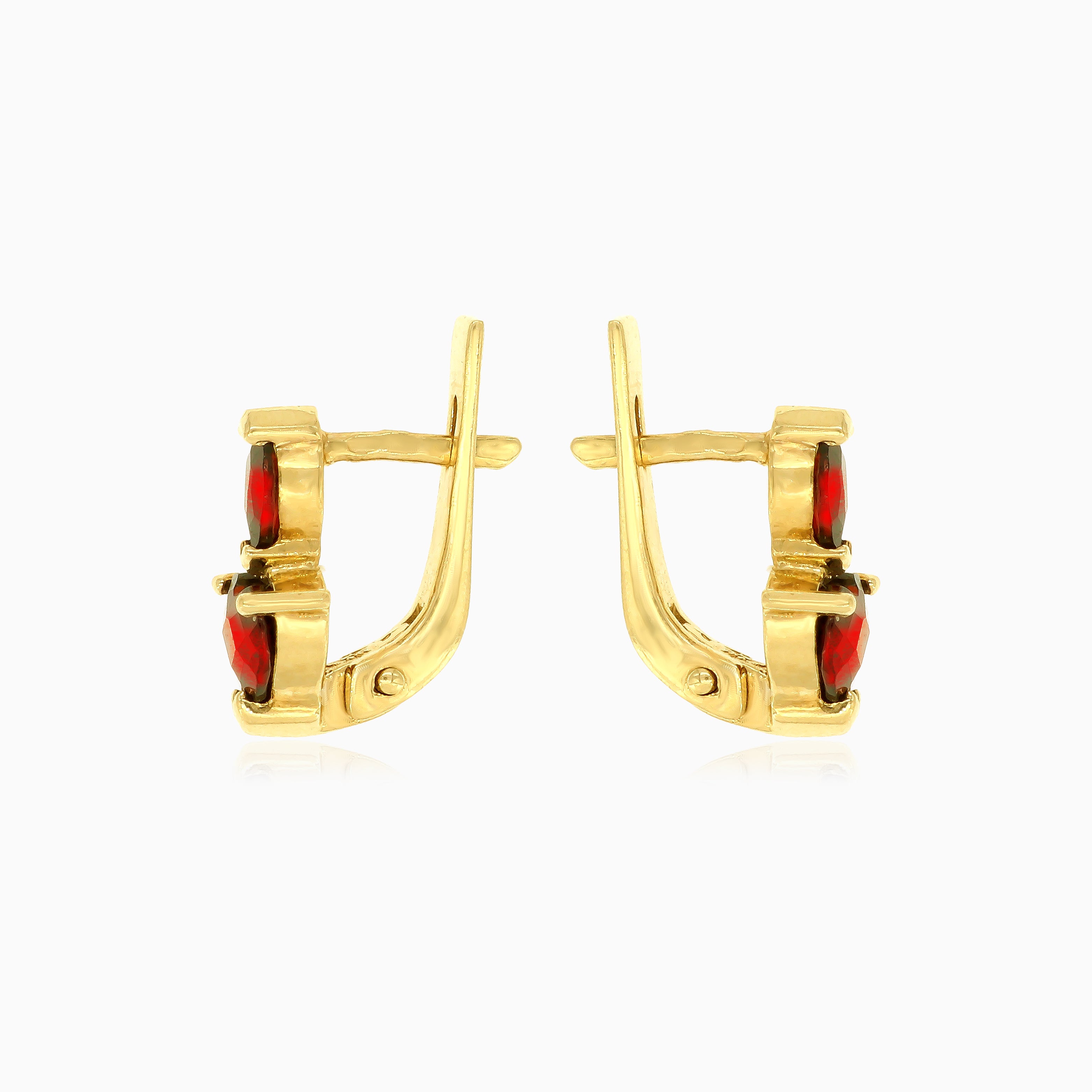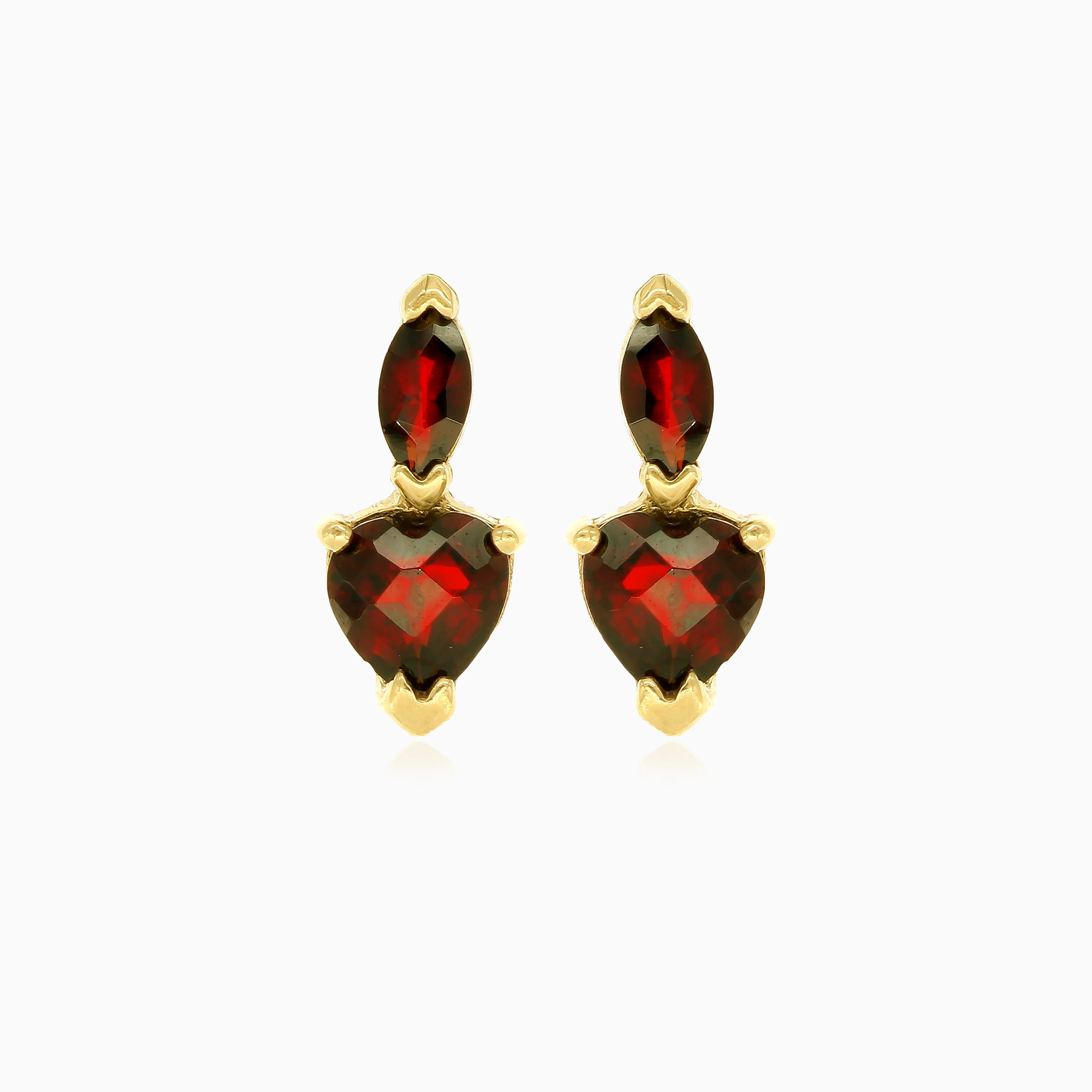Verleihen Sie Ihrem Look einen Hauch von Romantik mit unseren Herz- und Marquise-Granat-Tropfenohrringen. Mit fein geschliffenen Steinen in einer V-Krallenfassung, gefertigt aus 14 Karat Gelbgold und einem sicheren Klappverschluss.
