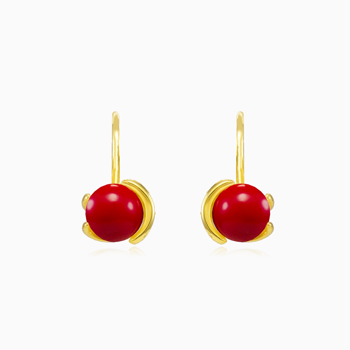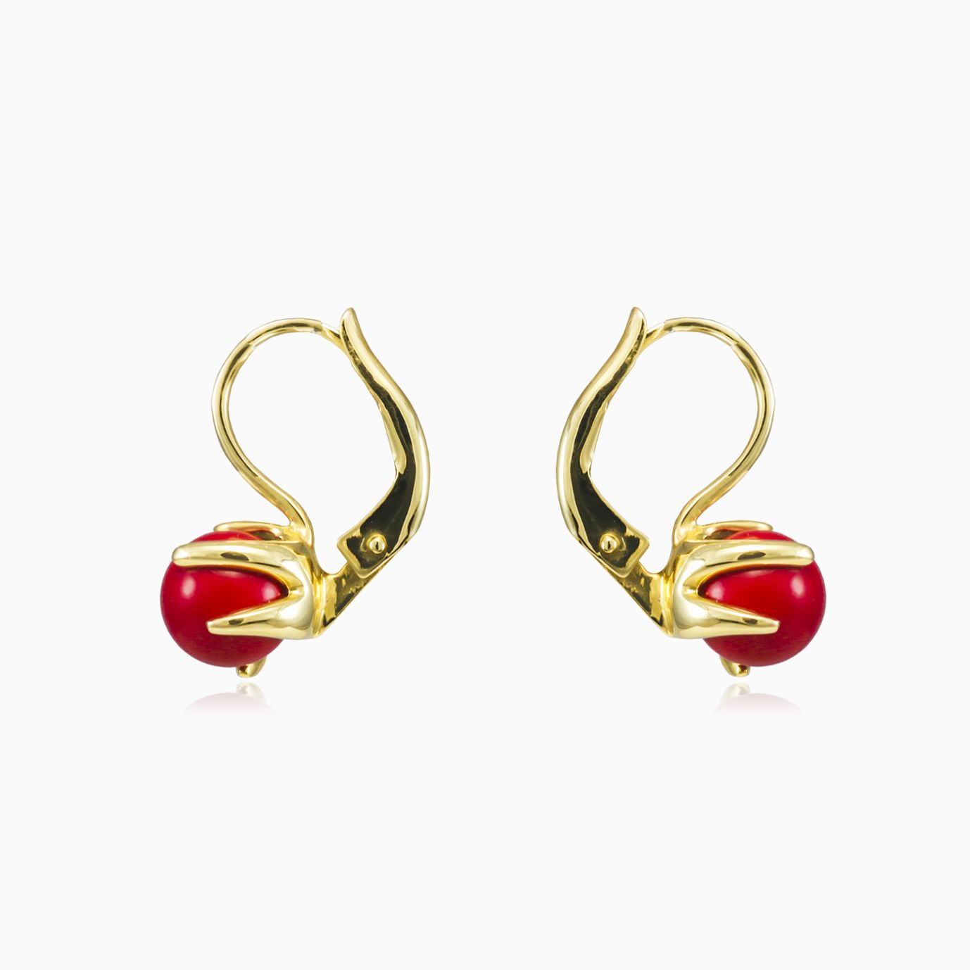Einzigartige 14K Gold-Ohrringe mit Anhänger, kombiniert mit rotem Korallenball.
