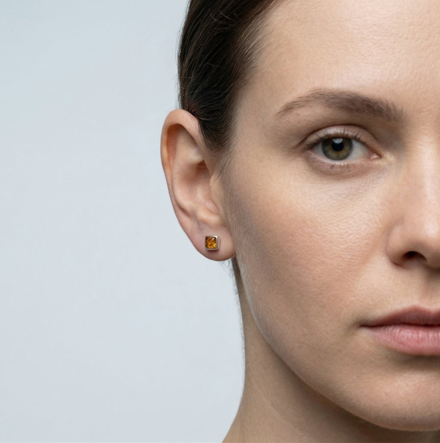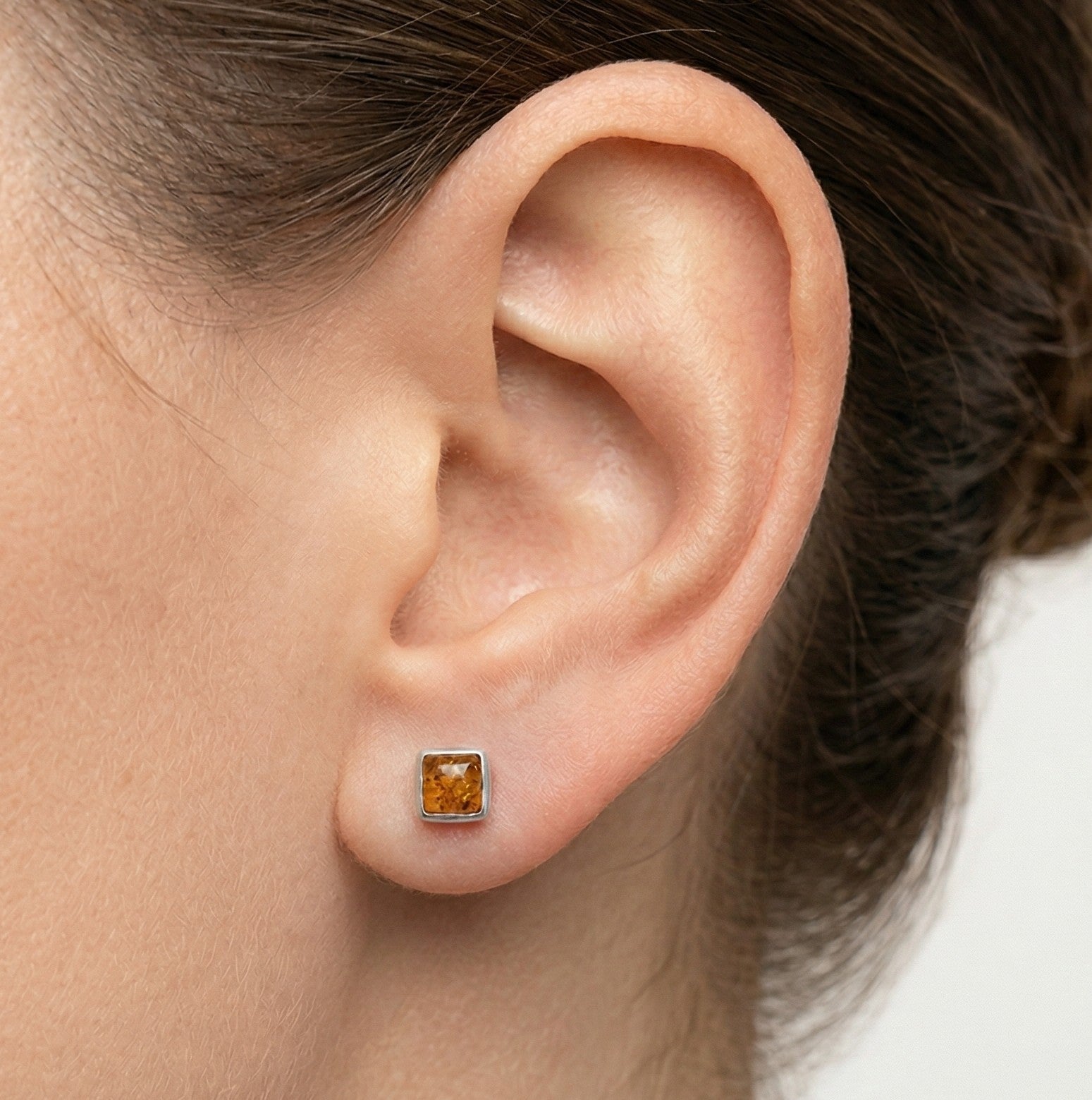Einfache Damenohrringe aus Sterlingsilber mit quadratisch geschnittenem Honigbernstein.