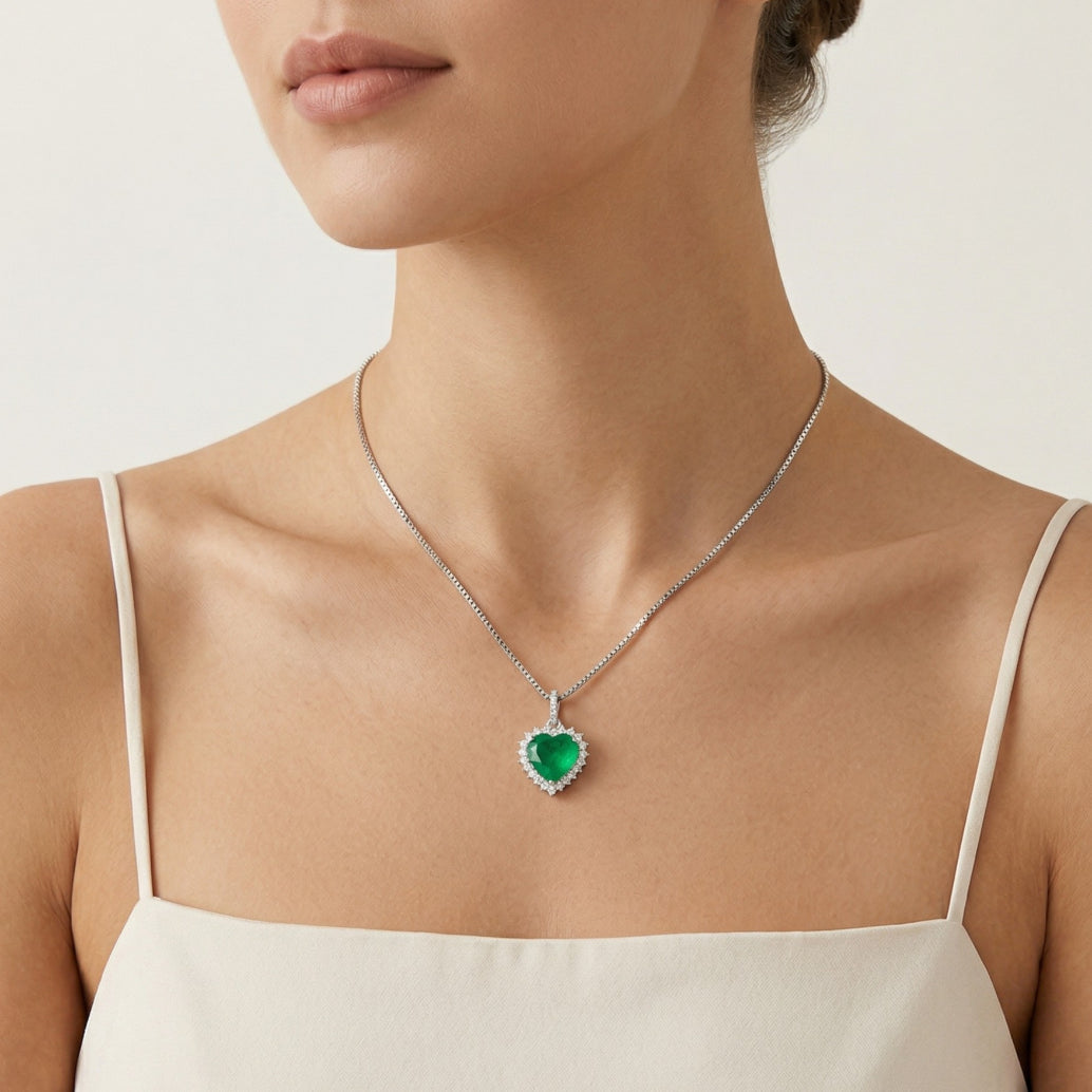 Royal gestaltetes Herz-Pendant, kombiniert mit einem Halo aus Zirkonia und einem herzförmigen synthetischen Smaragd.