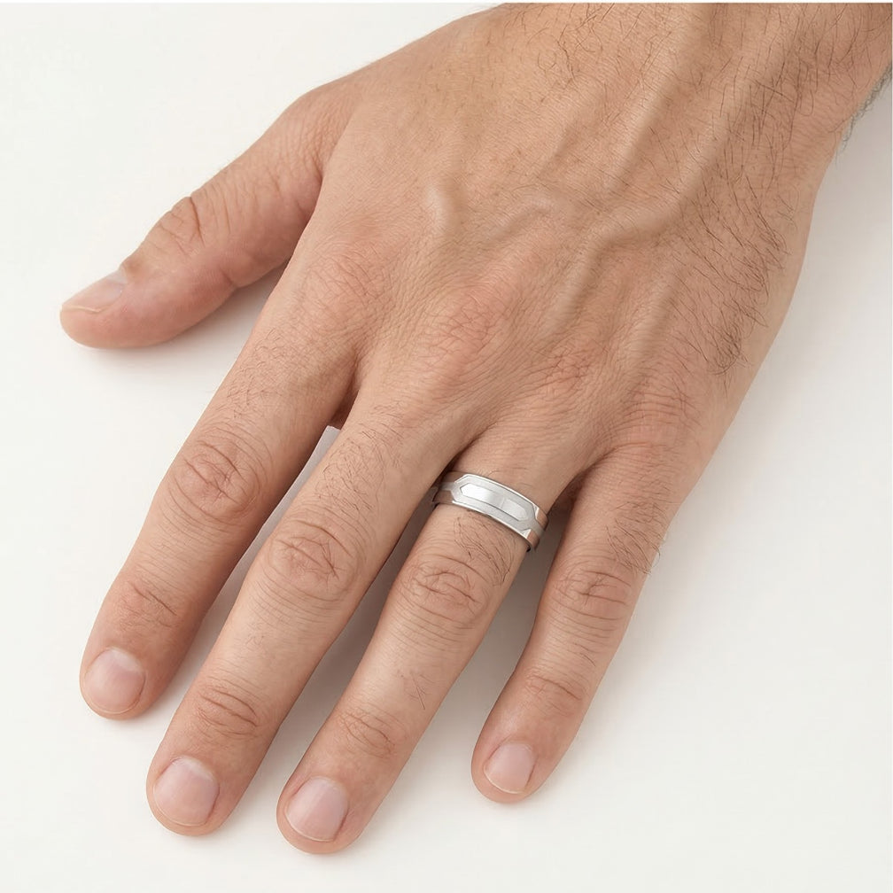 Dieser 14 Karat Weißgold-Ehering, entworfen für Frauen und Männer, zeichnet sich durch ein stilvolles und breites Band aus. Die detaillierte Gravur verleiht ihm eine besondere Note, während das matte Finish einen eleganten Kontrast zum hochglanzpolierten Weißgold bildet. Perfekt für diejenigen, die ein modernes, aber zeitloses Ehering ohne Steine suchen.
