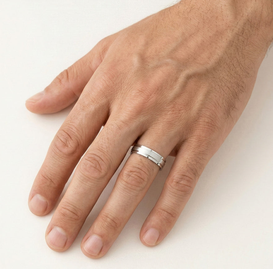 Dieser elegante Hochzeitsring für Männer und Frauen ist aus 14kt Weißgold gefertigt und zeigt ein einzigartiges Design mit einer Kombination aus matten und hochglanzpolierten Oberflächen. Mit einer Dicke von 4 mm bietet dieser Ring ein raffiniertes und elegantes Aussehen, perfekt für diejenigen, die ein unverwechselbares Schmuckstück suchen, um ihre Liebe zu symbolisieren.