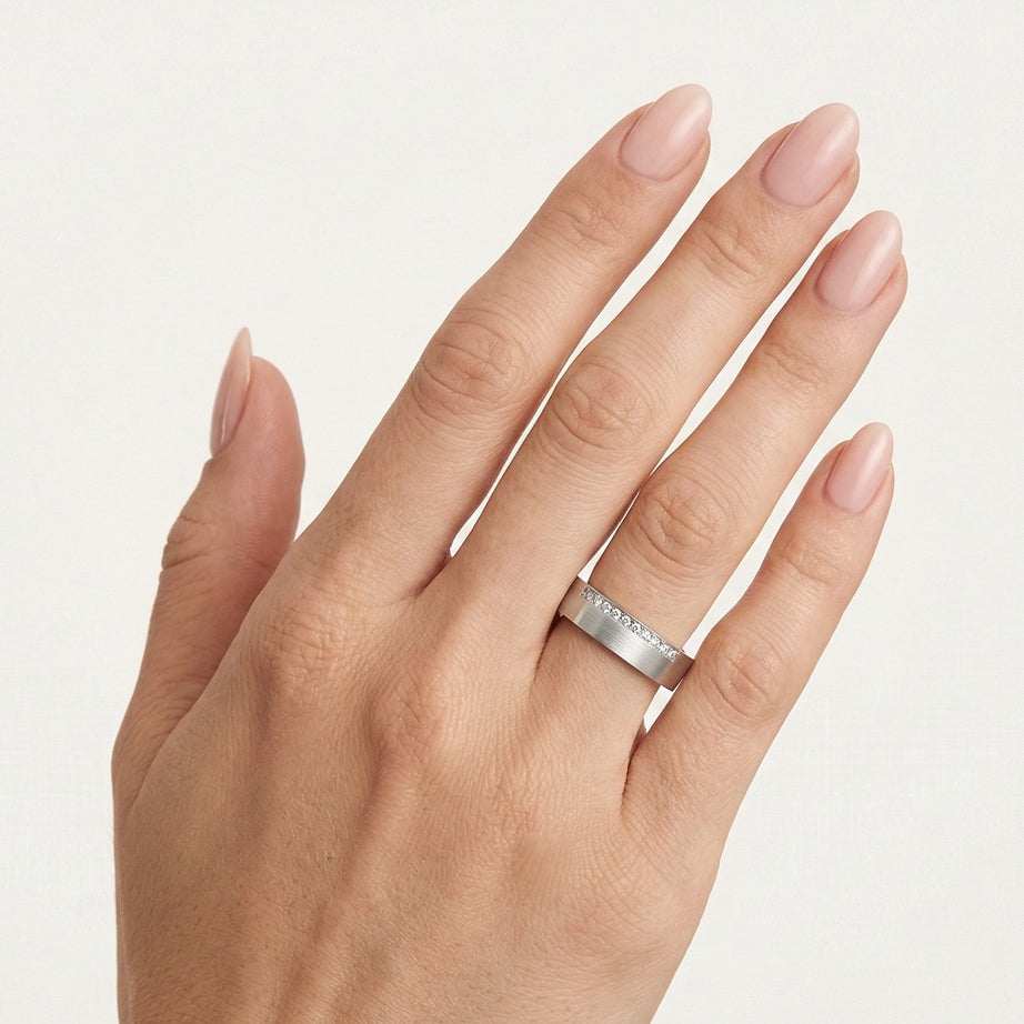 Unsere 14kt Weißgold-Eheringe für Männer und Frauen zeichnen sich durch ein raffiniertes Design aus. Der erste Ring ist mit 0,11 Karat optionalem Zirkonia oder Diamanten verziert, die nebeneinander im runden Feinstufen-Schliff mit einer Prong-Fassung angeordnet sind. Der zweite Ring ist schlicht, beide haben eine Dicke von 5 mm und verkörpern zeitlose Eleganz.