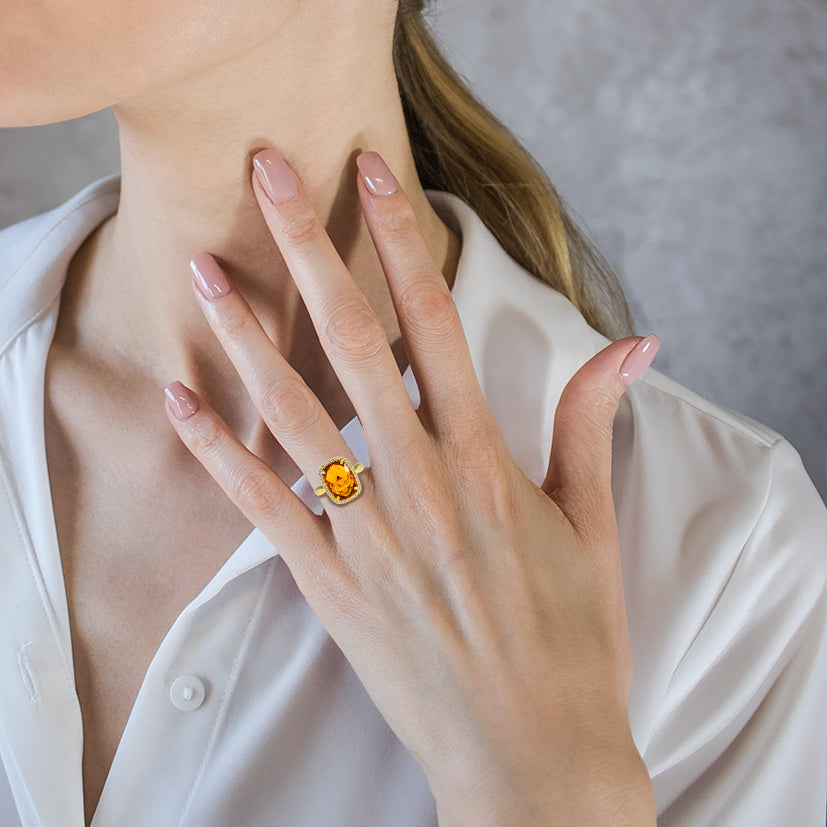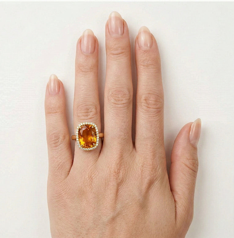 14K massiver Gelbgoldring, kombiniert mit Citrin im Kissenschliff, umgeben von einem Halo aus Zirkonia.