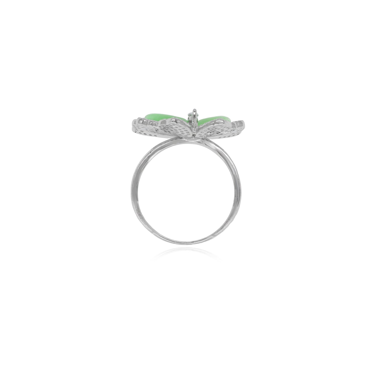 Dieser atemberaubende Ring aus Sterlingsilber präsentiert ein marquise-förmig fein facettiertes grünes Katzenauge, ergänzt durch rund fein facettierte Zirkonia. Die filigrane Krappenfassung verstärkt die Brillanz der Steine, während das elegante Schmetterlingsdesign dem Schmuckstück eine verspielte und anmutige Note verleiht.