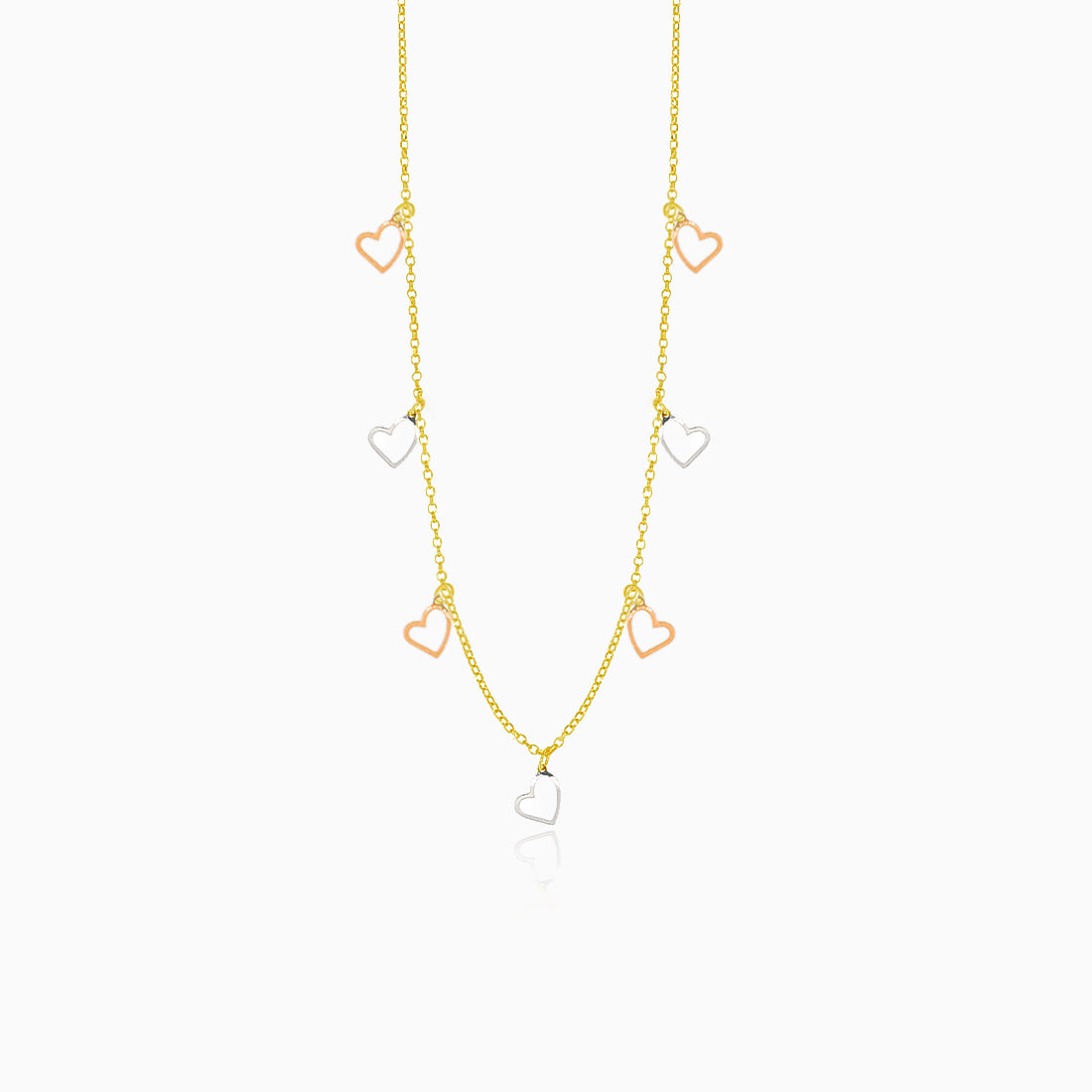 Diese interessante Halskette ist aus 14 Karat Gold gefertigt. Die Kette besteht aus Gelbgold, an der vier Roségold-Herzen und drei Weißgold-Herzen als Umrisse befestigt sind. Die Halskette hat einen Karabinerverschluss.