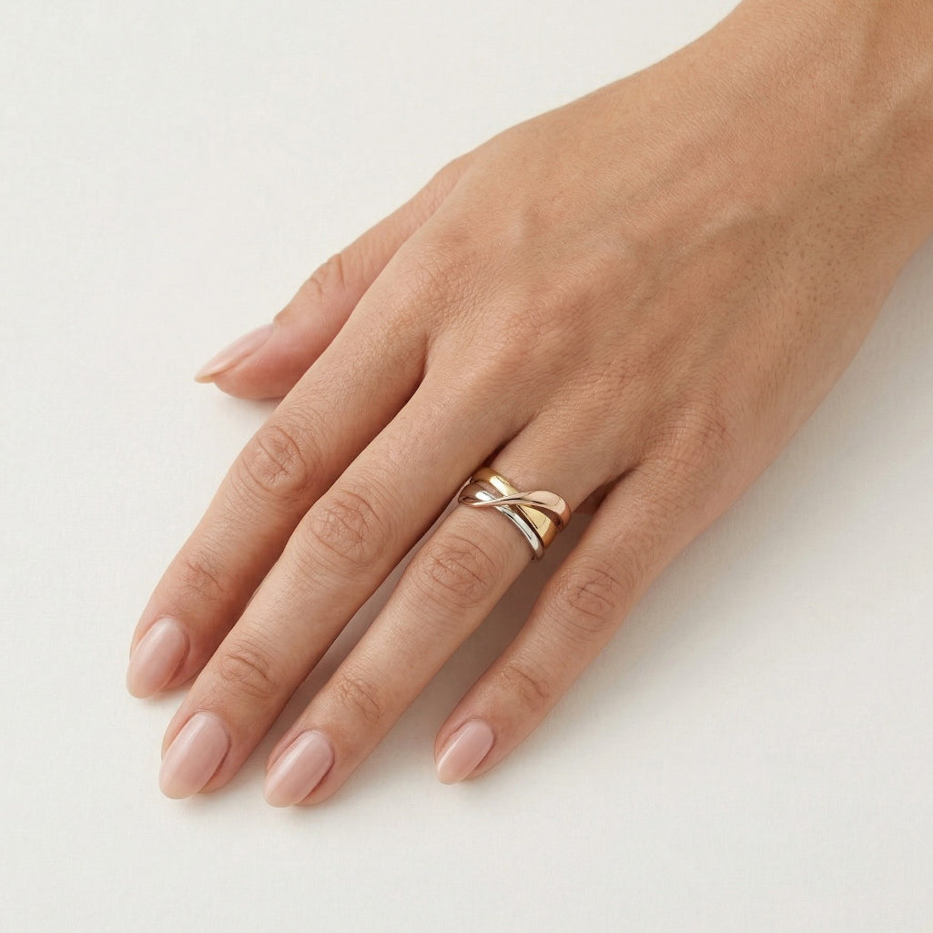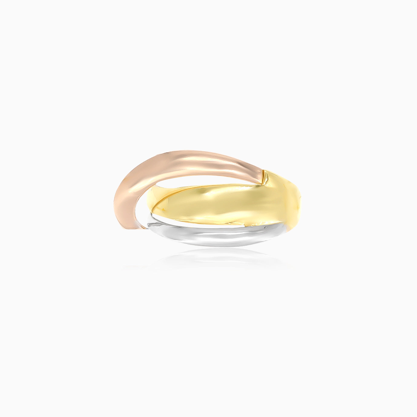 Verleihen Sie Ihrem Outfit einen Hauch von Eleganz mit diesem atemberaubenden Damenring aus 14kt Gelb-, Weiß- und Roségold. Mit hochglänzender Oberfläche und minimalistischem Design ohne Steine strahlt er zeitlosen Stil und Raffinesse aus.
