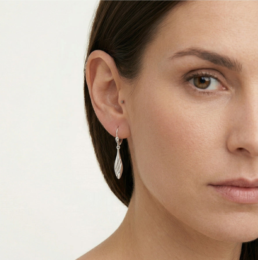 Diese 14kt Weißgold-Hängeohrringe haben eine längliche Tropfenform mit einer einzigartigen matten Oberfläche. Ein abschließendes Diamantschliffmuster hebt ihre Eleganz hervor. Ausgestattet mit einem Klappbügelverschluss bieten sie sicheren Halt.
