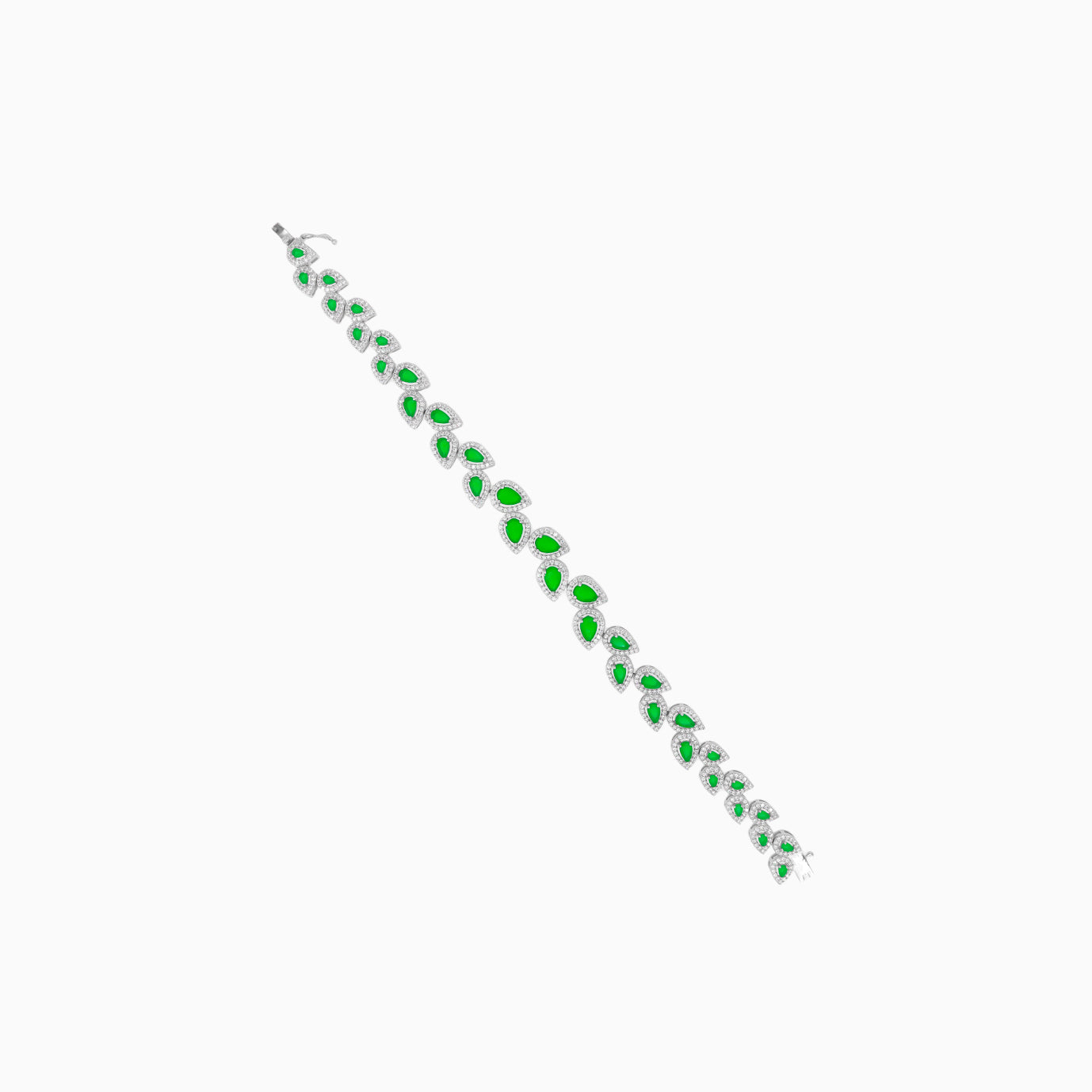 Steigern Sie Ihre Eleganz mit diesem Armband aus Sterlingsilber, das tropfenförmig fein facettierte synthetische Smaragde zeigt, umgeben von einem funkelnden Zirkonia-Halo. Die Krappenfassung und das Kastenschloss garantieren Haltbarkeit und Komfort, was es zu einer strahlenden Wahl für jeden Anlass macht.