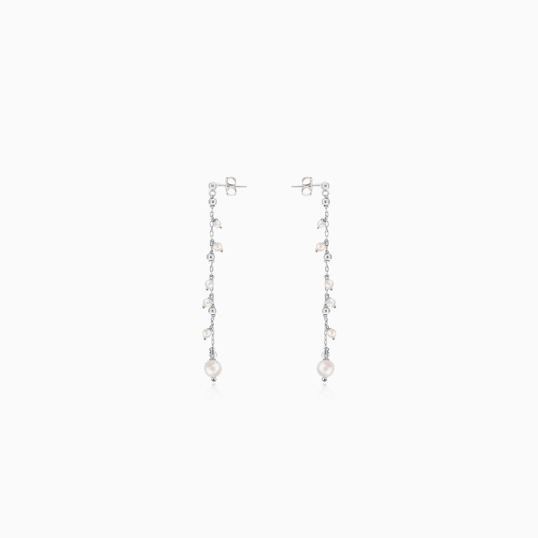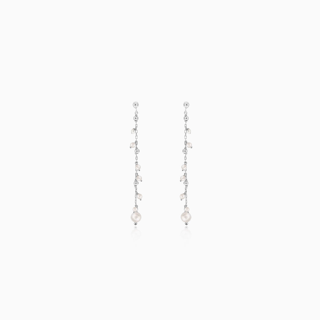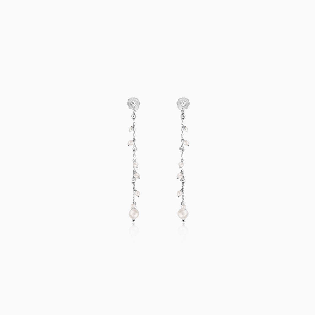 Elegantly gefertigt aus 14K Weißgold, zeigen diese hängenden Ohrringe eine Reihe entzückender kleiner Perlen. Eine größere Perle ziert den unteren Teil jedes Ohrrings und verstärkt dessen Charme. Sie sind sicher mit einem Pousette-Verschluss befestigt.