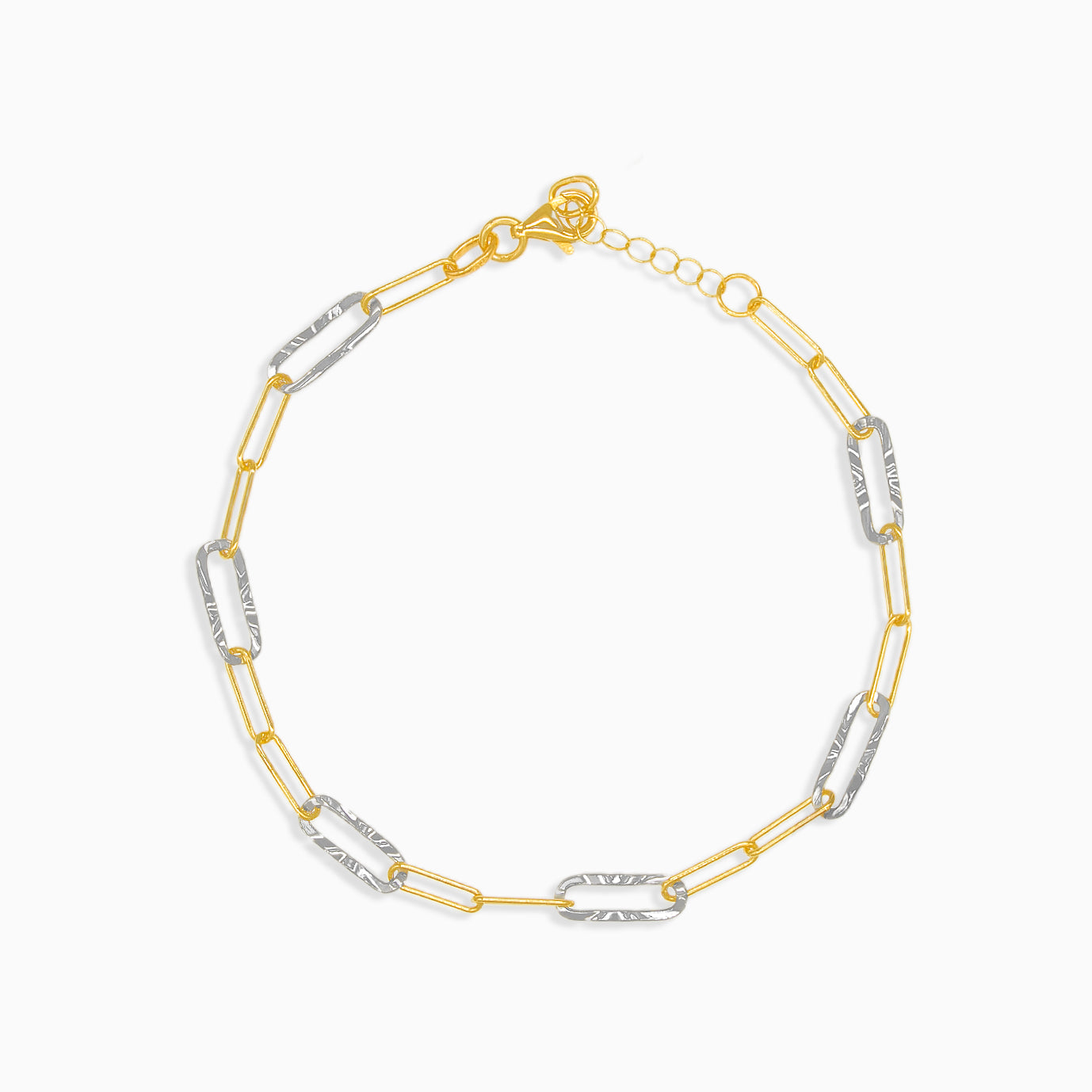 Verleihen Sie Ihrem Stil mit unserem eleganten zweifarbigen Armband aus 14 Karat Weiß- und Gelbgold mit mittelgroßen Gliedern Ausdruck. Das Armband ist mit einem sicheren Karabinerverschluss versehen.