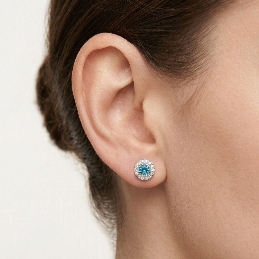 Tyto elegantní náušnice z bílého zlata zdobí zářivý safír obklopený diamantovým halem. Precizní zpracování přináší sofistikovaný třpyt a nadčasovou eleganci pro každý den i slavnostní příležitosti.