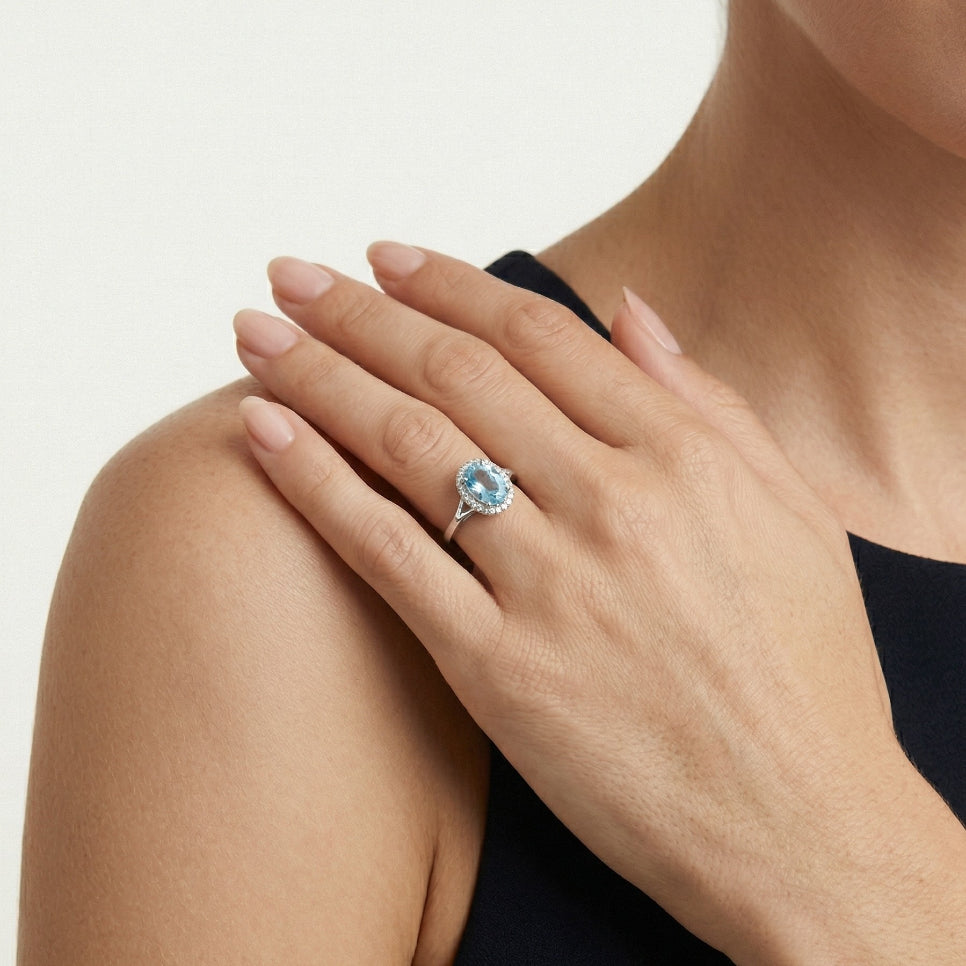 Elegantní prsten z bílého zlata zdobí zářivý modrý topaz obklopený diamanty. Precizní zpracování přináší sofistikovaný třpyt a nadčasovou eleganci vhodnou pro každý den i slavnostní příležitosti.