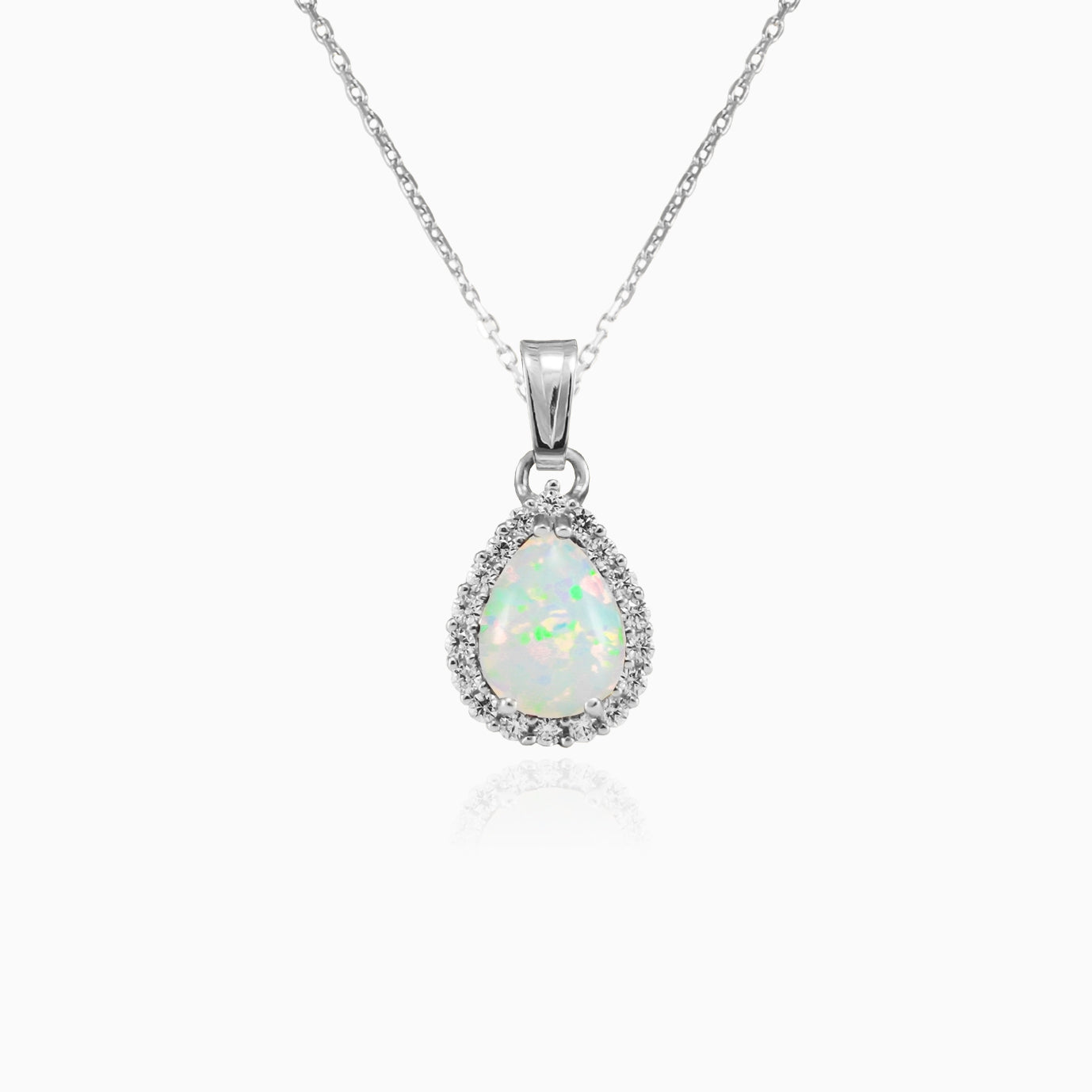 Dieser atemberaubende Damenanhänger aus 14kt Weißgold verfügt über einen zentralen birnenförmigen Cabochon-Weißopal, umgeben von runden, fein im Stufenschliff geschliffenen Zirkonia. In Krappenfassung vereint der Anhänger sanften Schimmer mit königlichem Funkeln und bietet ein elegantes, majestätisches Design.