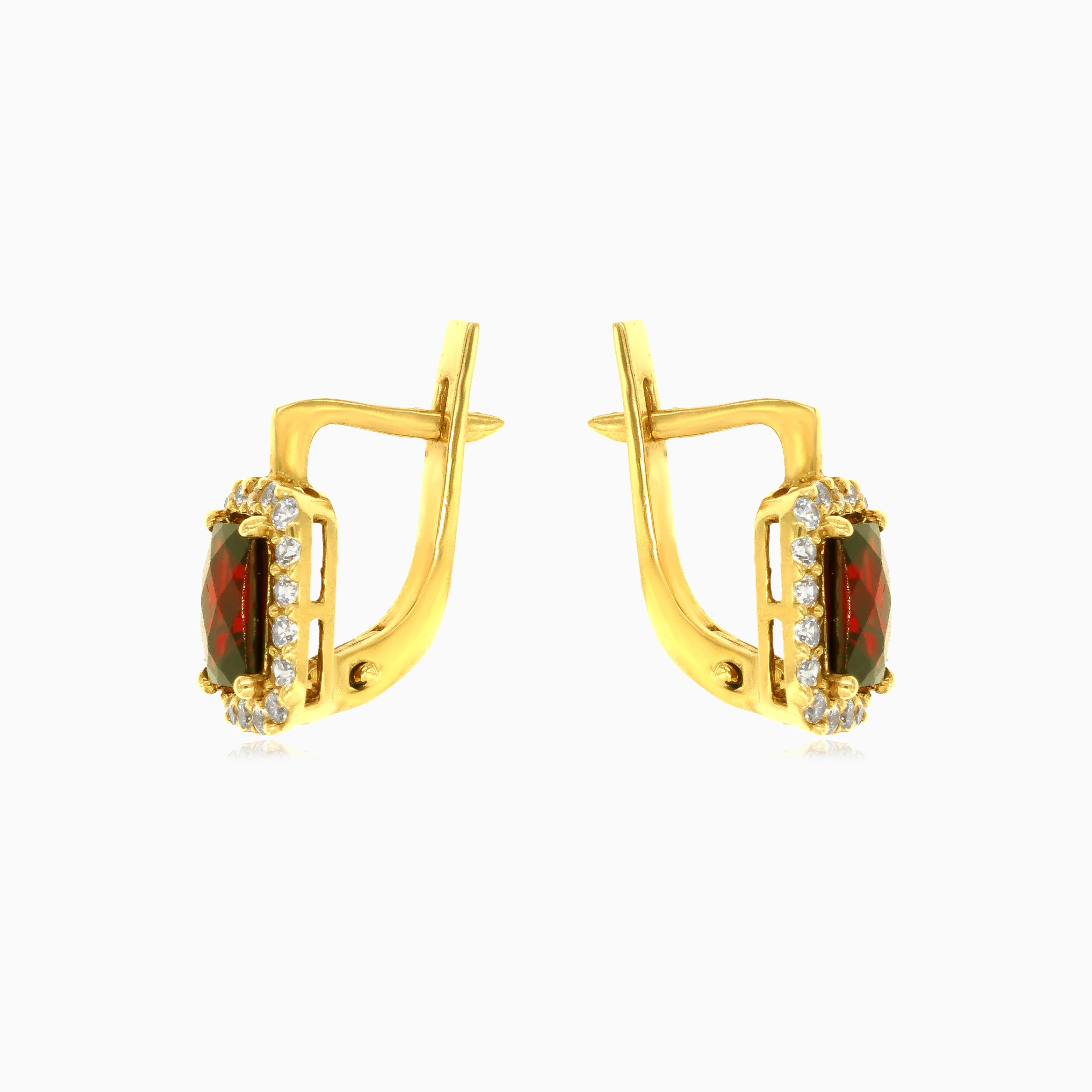 Schmücken Sie sich mit königlicher Raffinesse mit diesen 14-karätigen Gelbgold-Ohrringen in Tropfenform, ausgestattet mit einem faszinierenden, stufenförmig geschliffenen Granat und umliegenden rund geschliffenen Zirkonia. Die Vier-Krappen-Fassung und der sichere Klappbügelverschluss garantieren eine zeitlose und elegante Ergänzung Ihrer Schmucksammlung.