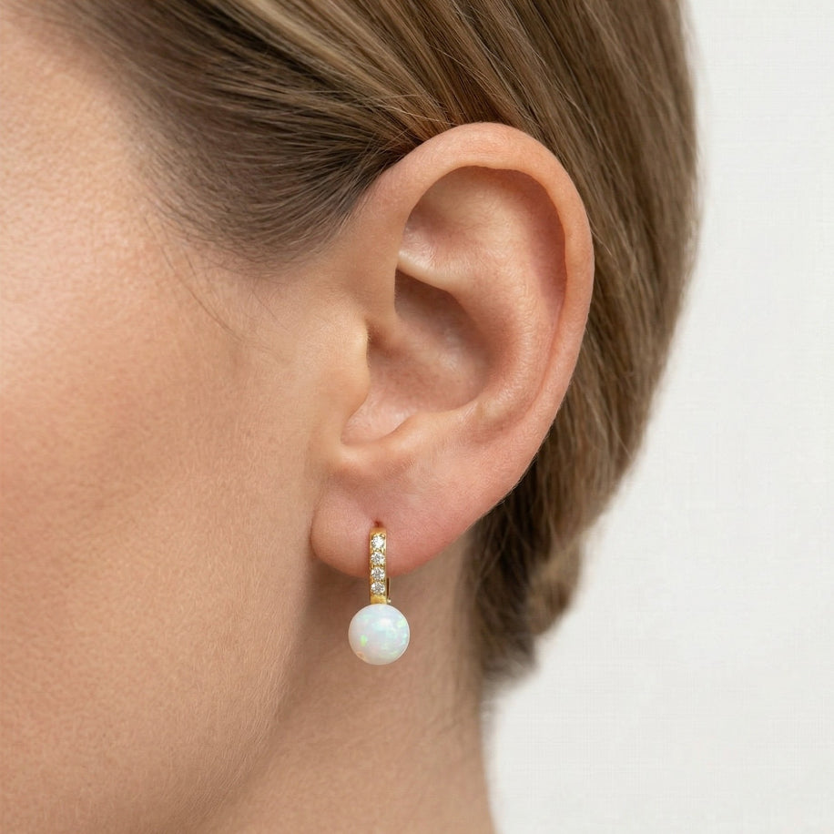 Akzent-Ohrringe mit weißem Opal, gefertigt aus 14 Karat Gelbgold und verziert mit einer Linie aus Zirkonia.