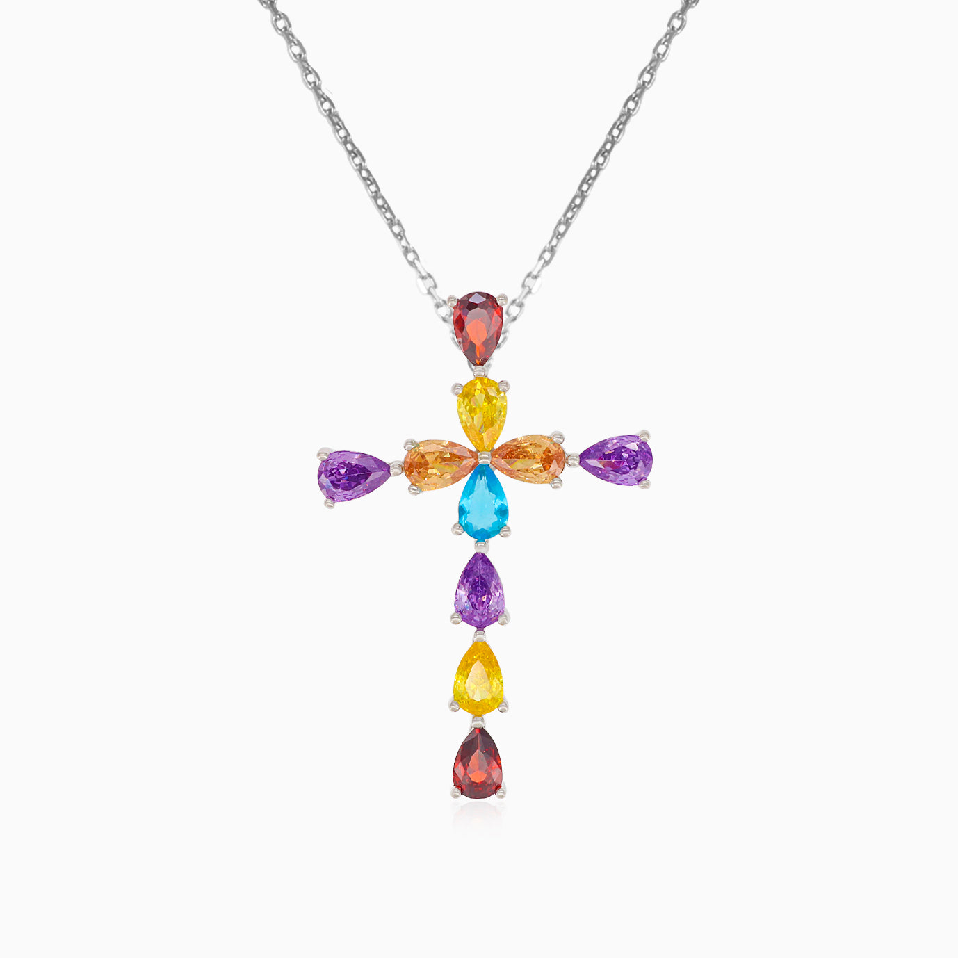 Women’s sterling silver pendant featuring a stunning cross design adorned with pear-shaped amethyst, citrine,garnet and blue topaz gemstones in a prong setting. A vibrant and elegant piece that adds a colorful and meaningful touch to any ensemble.