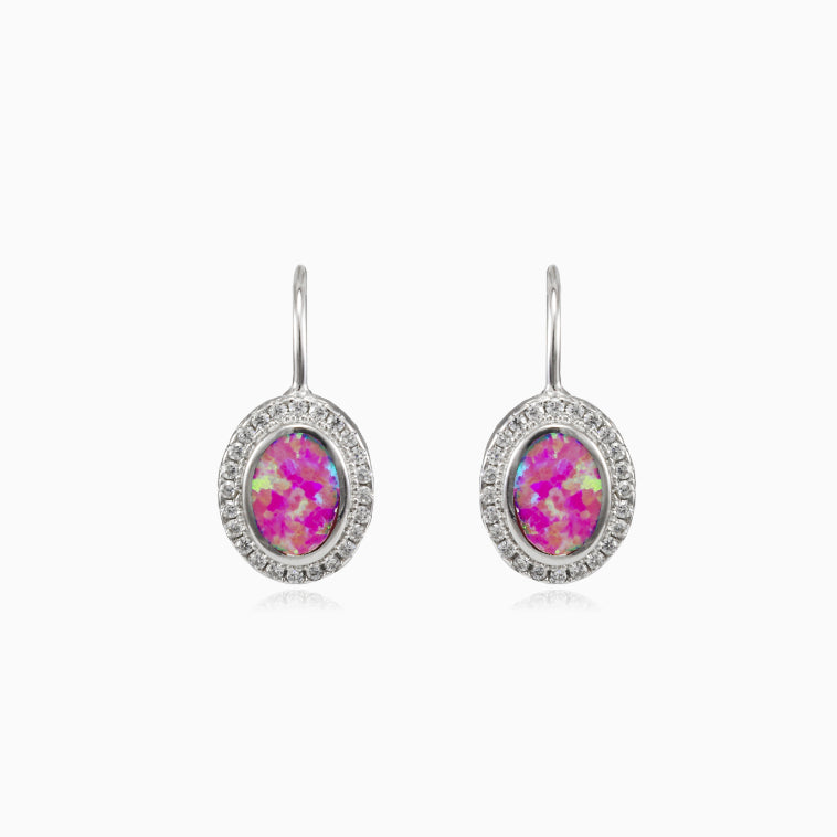 Oval rose opal paste earrings made of sterling silver and combined with halo of cubic zirconia.