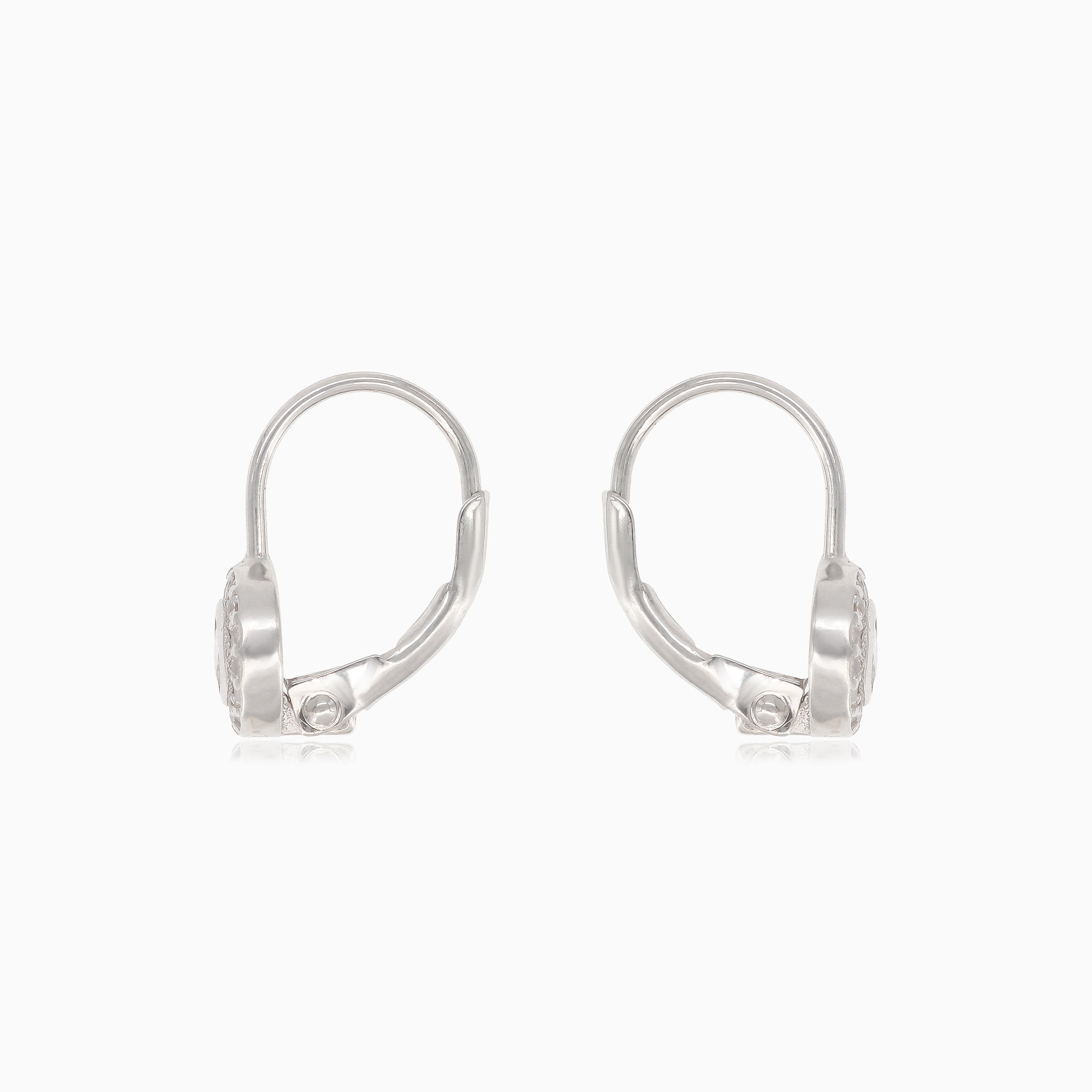 Chic silver drop earrings featuring a large round cubic zirconia stone surrounded by smaller cubic zirconia stones, secured with lever back closures.