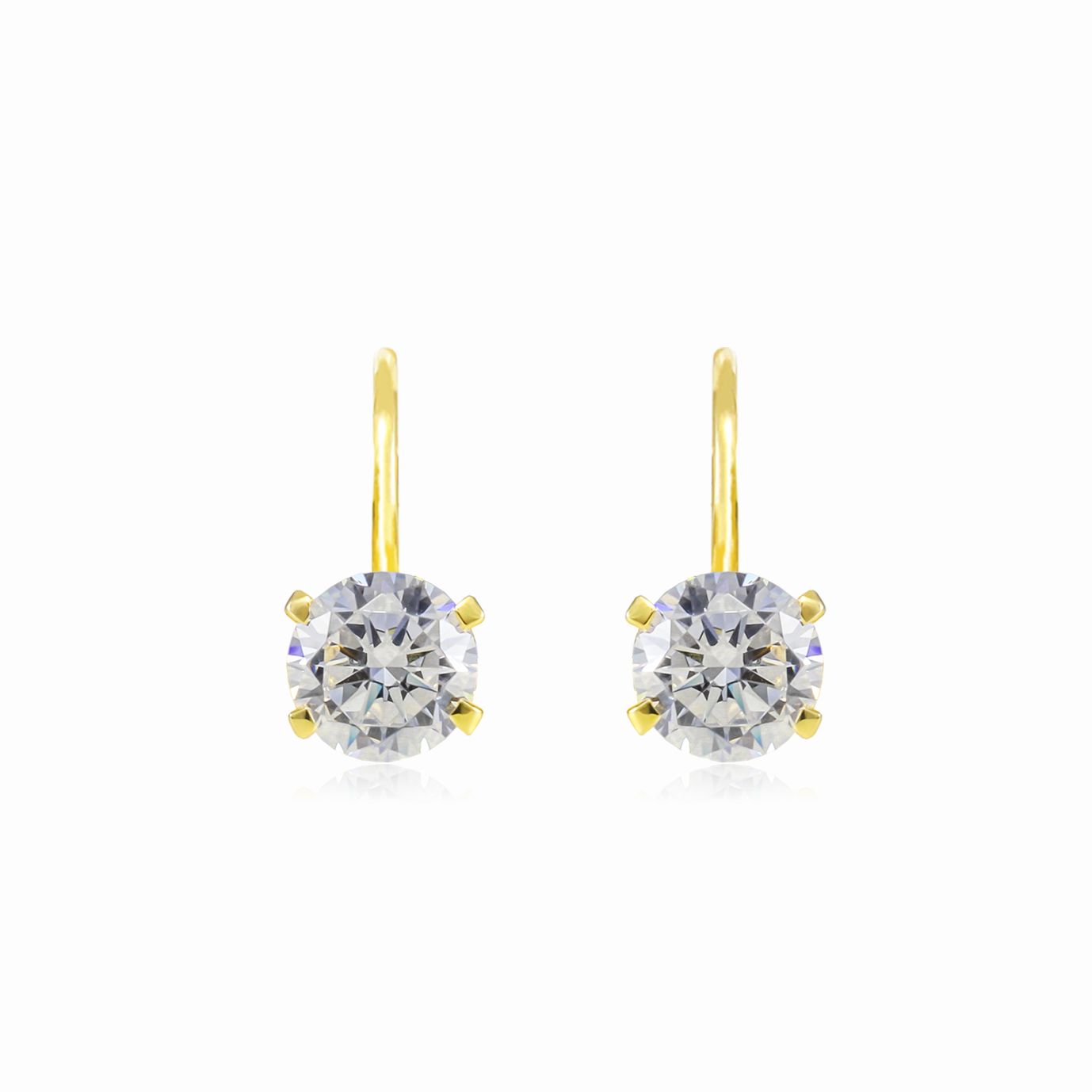 Four prong 14K yellow gold drop earrings with central round cut cubic zirconia.