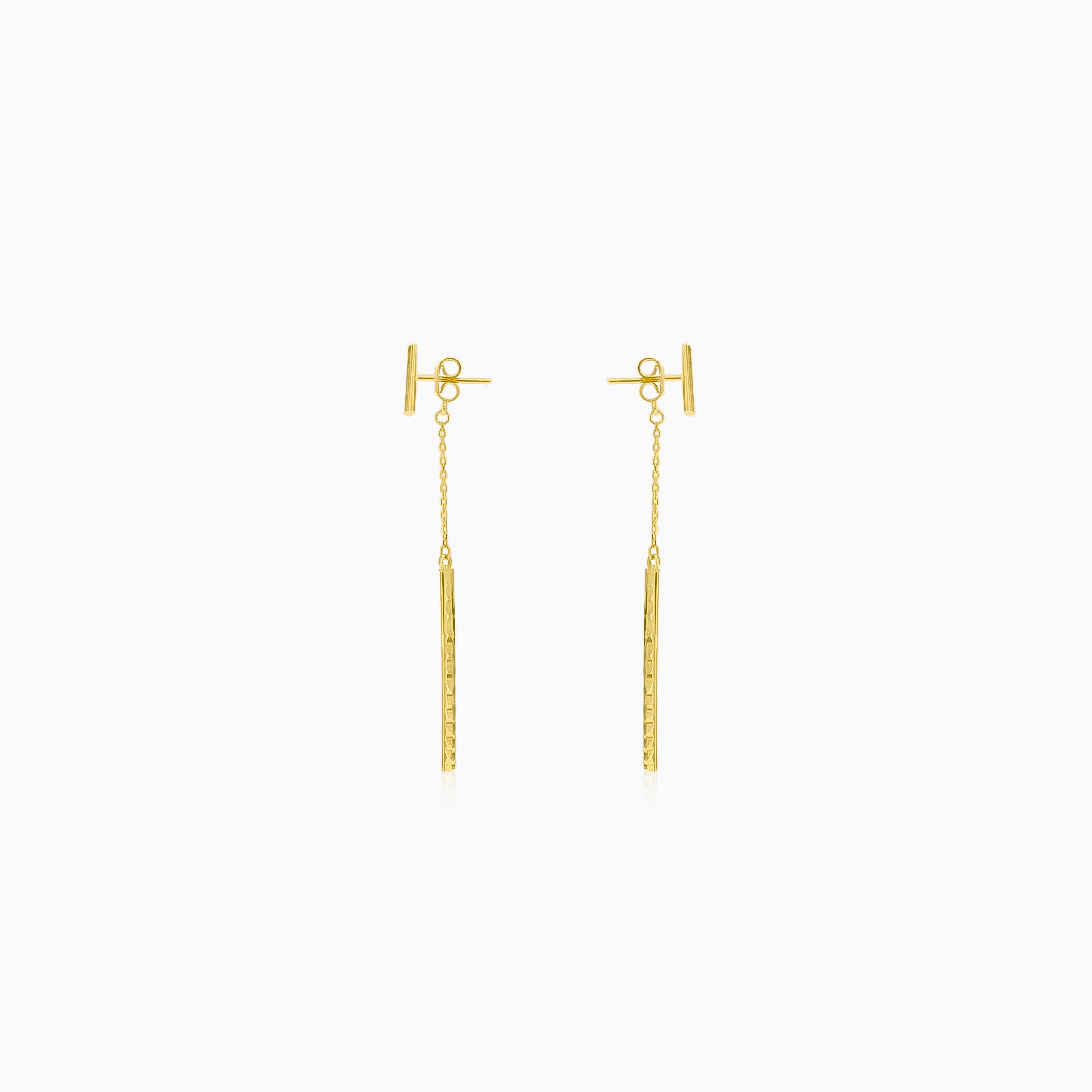 Crafted from 14 carat yellow gold, these exquisite earrings feature a design with a chain from which a patterned stick dangles. With a highly polished surface, they exude charm and sophistication. They're secured with a stud pousette closure, epitomizing unique modernity.