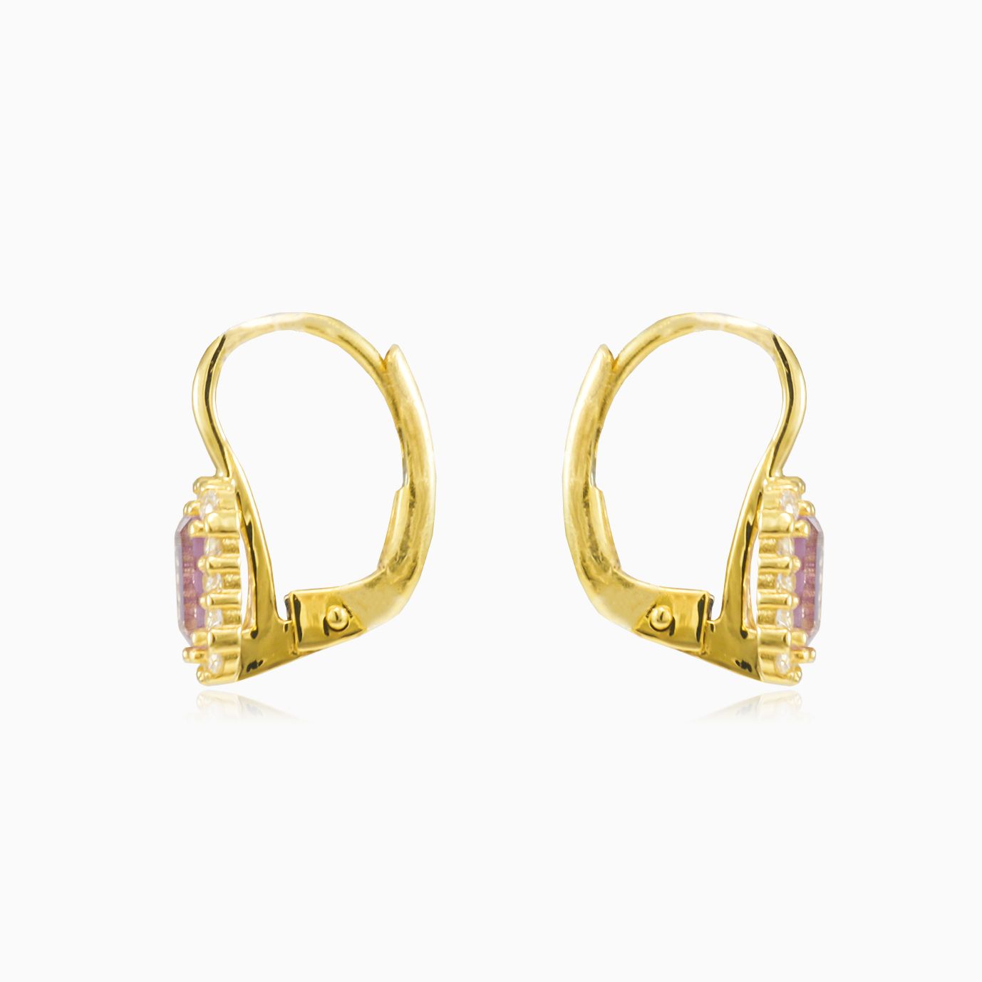 14K yellow gold drop earrings combined with emerald cut purple amethyst and a halo of cubic zirconia.