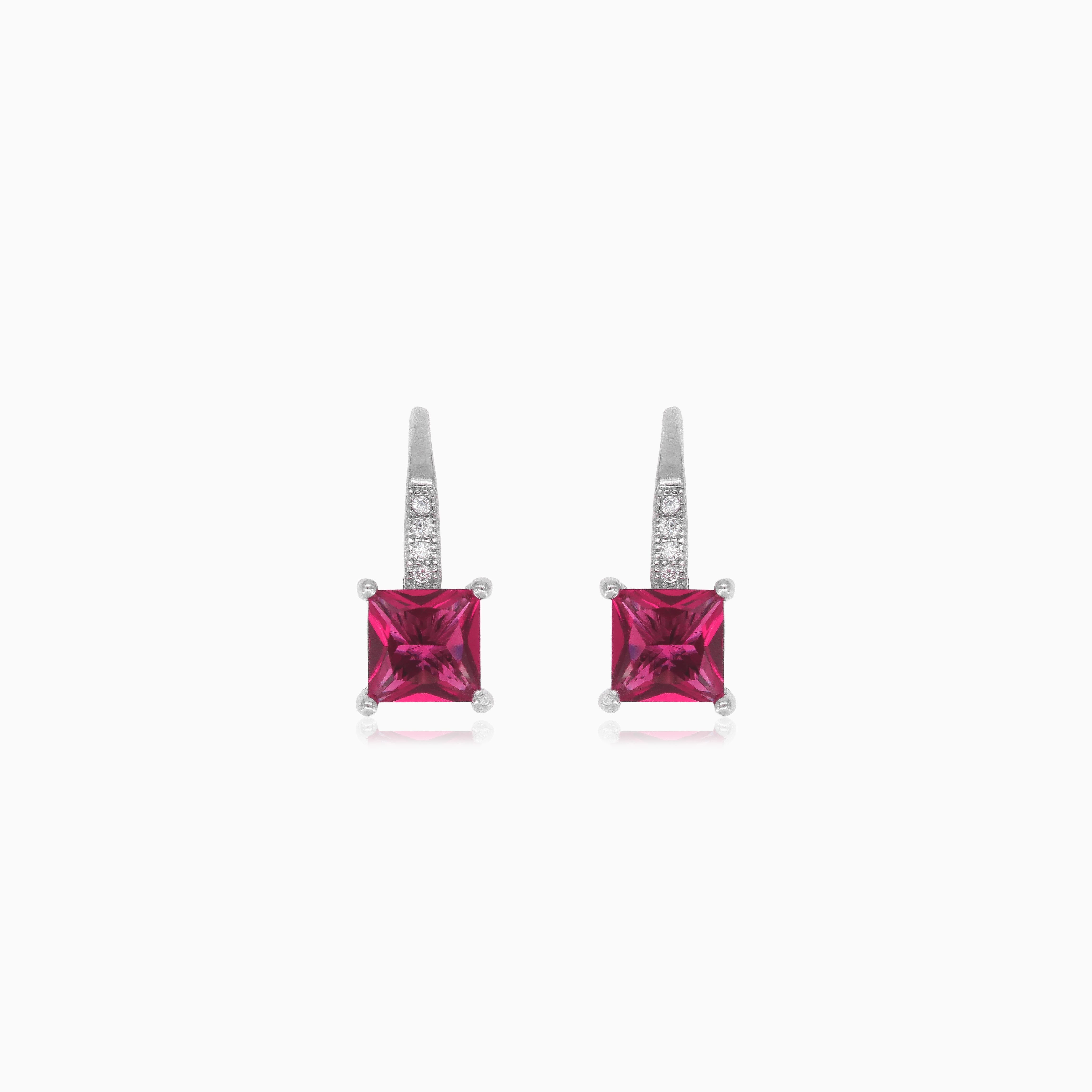 Sophisticated sterling silver drop earrings featuring a square princess-cut synthetic ruby secured in a prong setting. Accented with a round cubic zirconia on the hook for a touch of sparkle, these earrings boast a lever-back closure for security and comfort. A beautiful, versatile addition to any jewelry collection.