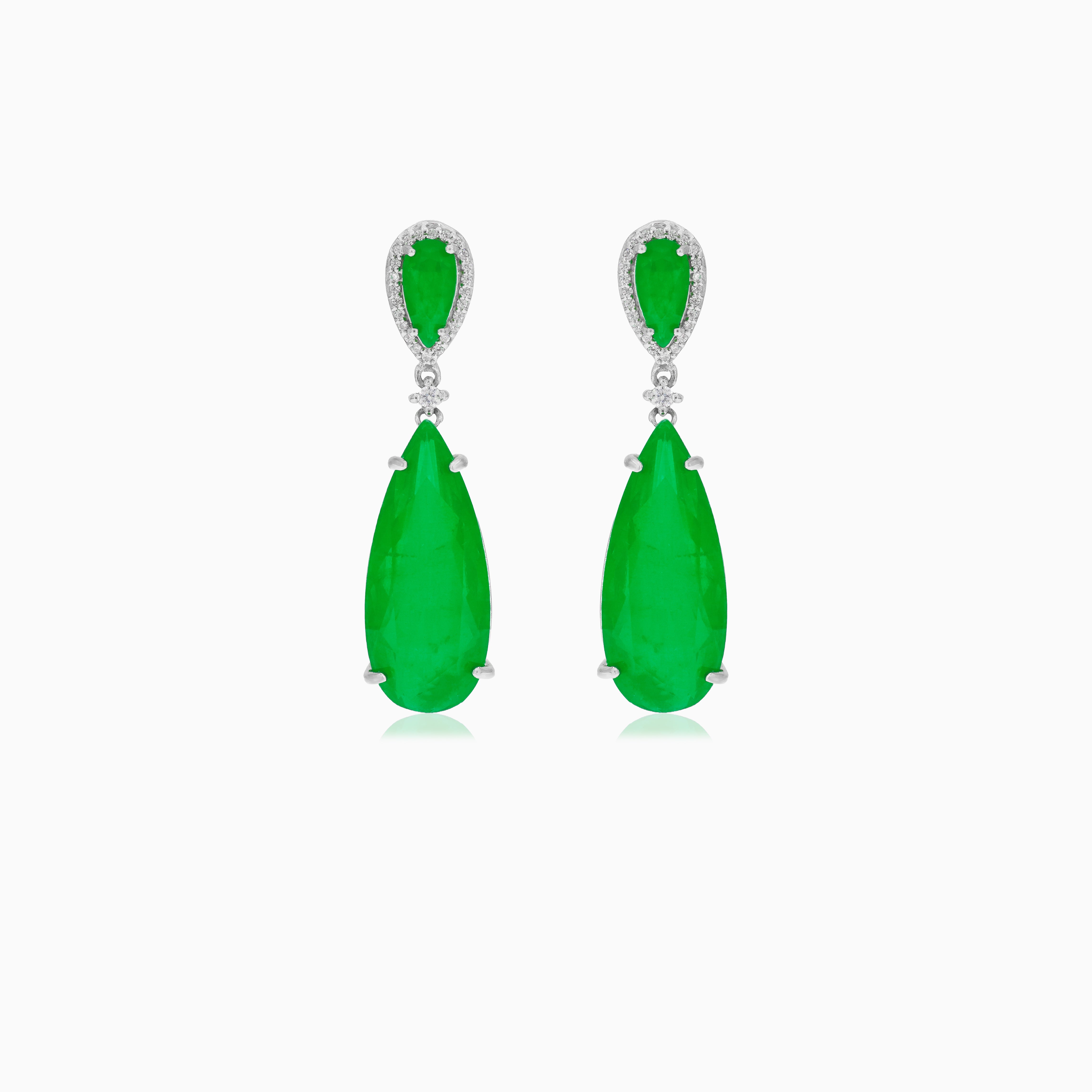 These elegant sterling silver dangling earrings feature a striking pear-cut synthetic emerald, complemented by shimmering round-cut cubic zirconia accents. Each gemstone is prong-set to enhance sparkle and durability. Secured with a stud pousette closure, these earrings are ideal for a touch of timeless elegance.