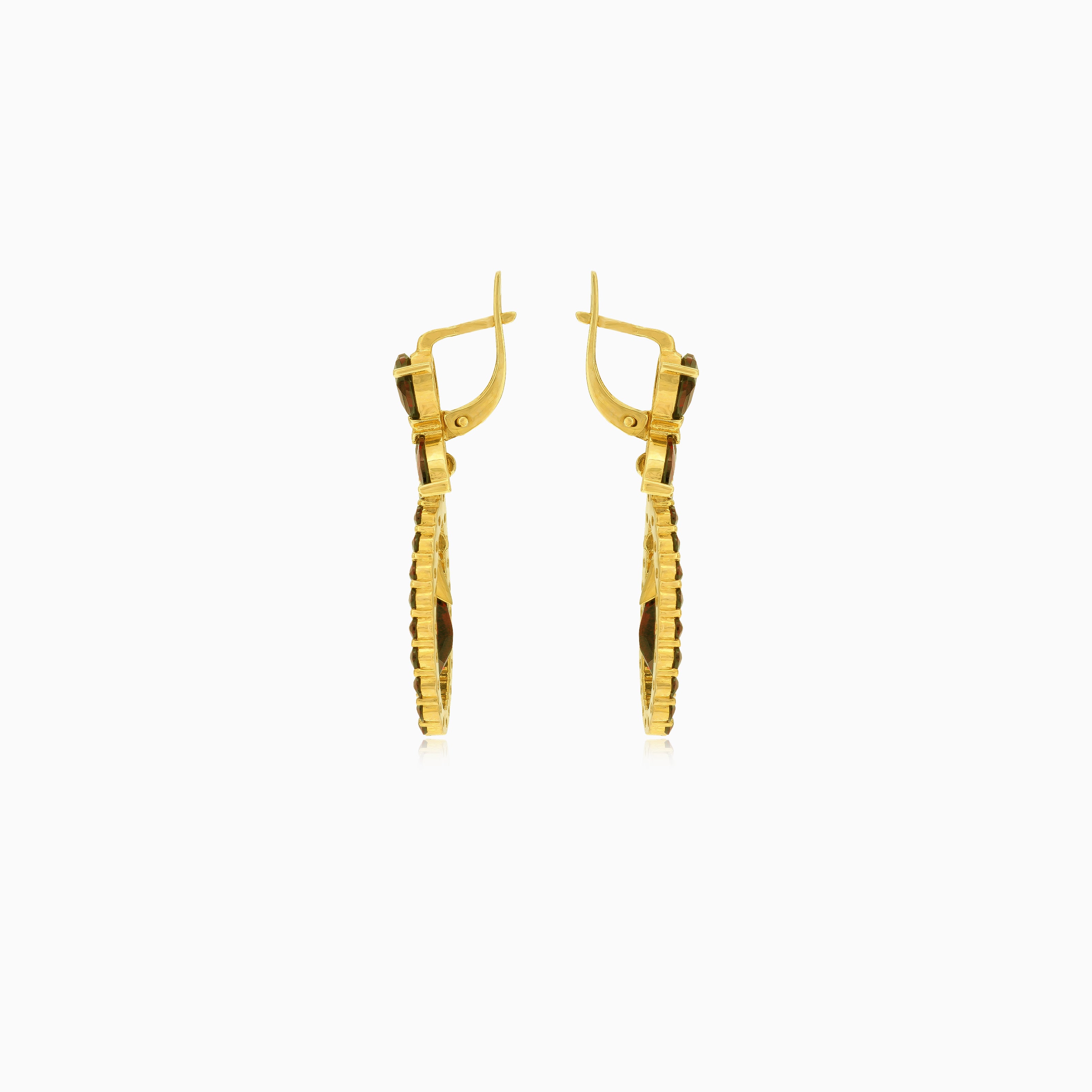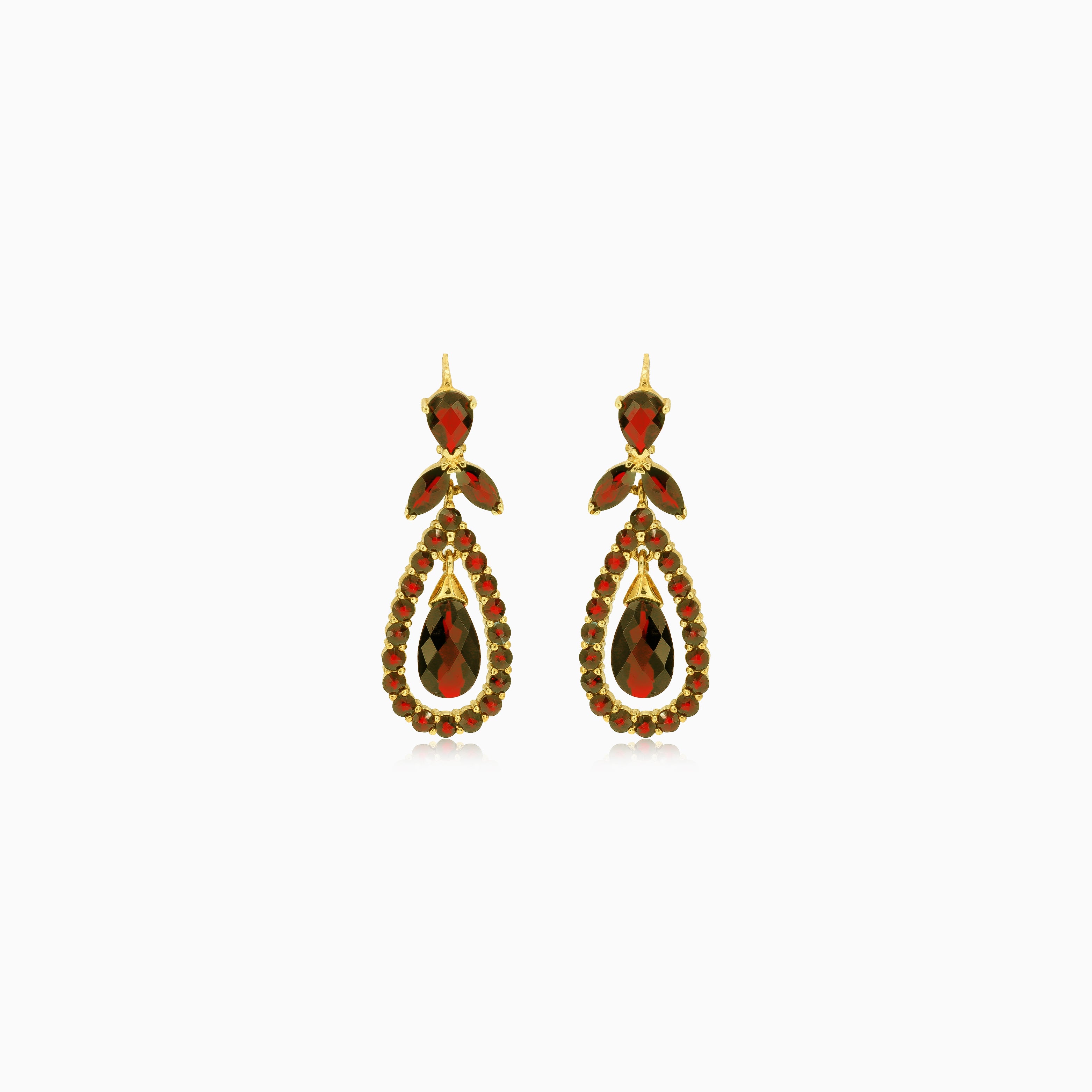 Elevate your style with these stylish 14kt yellow gold dangling earrings featuring garnet stones in marquise and round fine step-cut. The earrings are crafted with a secure latch back closure and a shared prong setting, adding sophistication to your look.