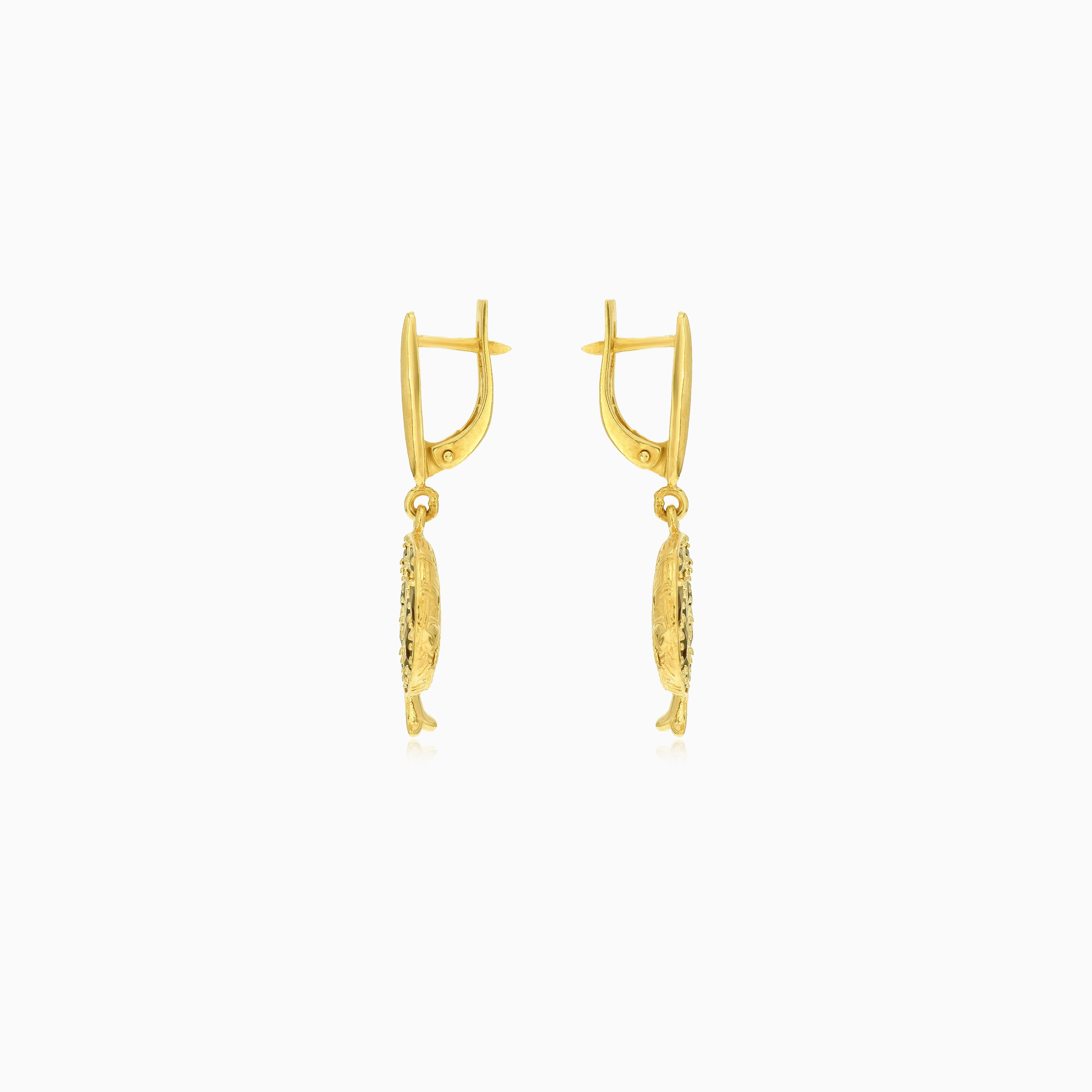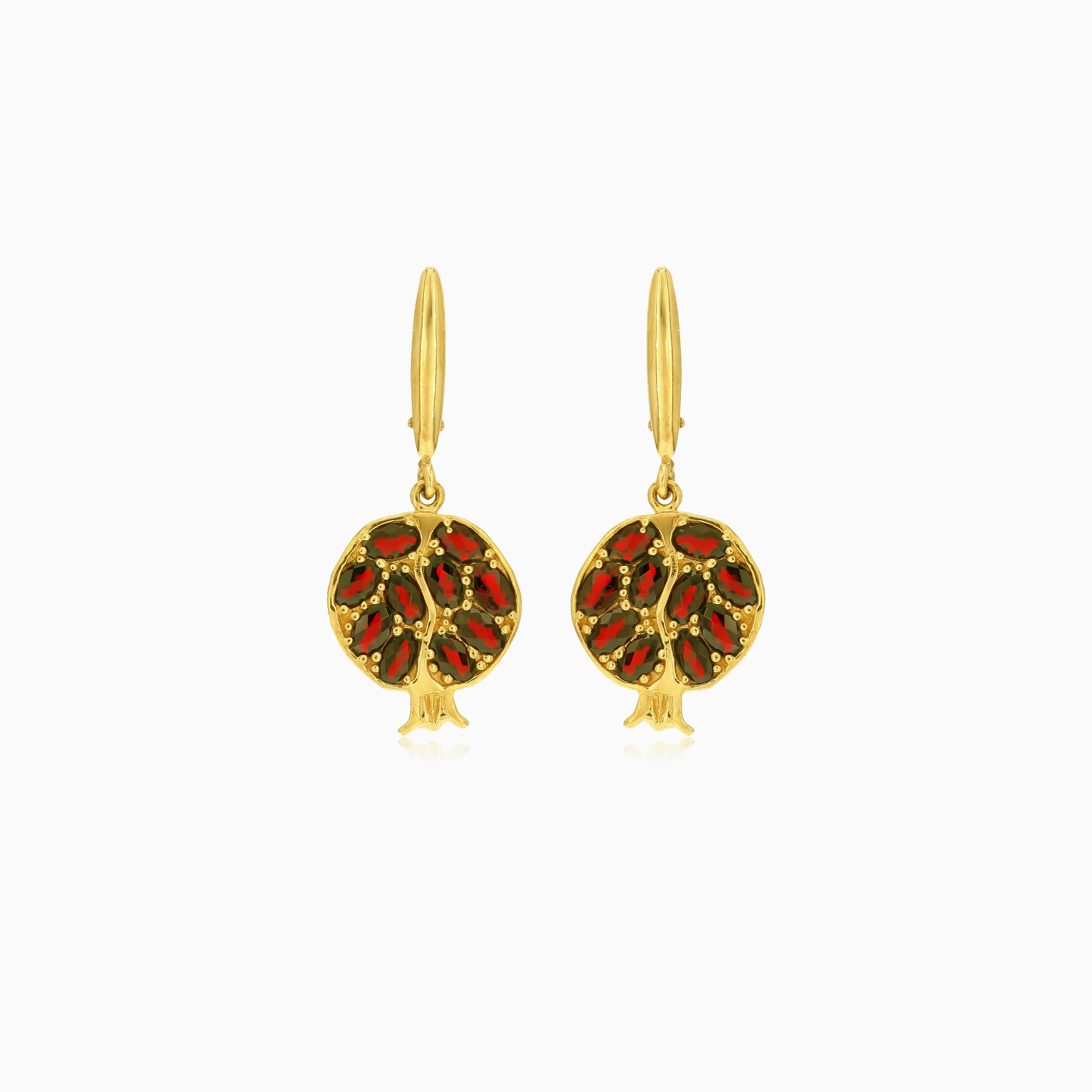 Embrace sophistication with these pomigranate 14kt yellow gold dangling earrings featuring a garnet stone in an oval fine step-cut. The earrings boast a secure latch back closure and a 4 prong setting, ensuring a timeless and elegant addition to your jewelry collection.