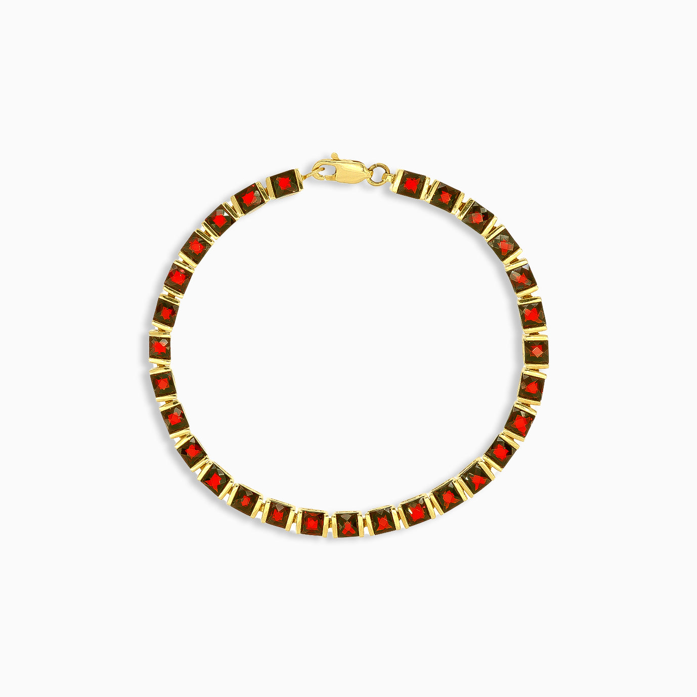 This women's bracelet showcases stunning square princess-cut garnets set in 14kt yellow gold with a sleek bar setting and secure lobster clasp closure, offering a touch of sophistication to any ensemble.