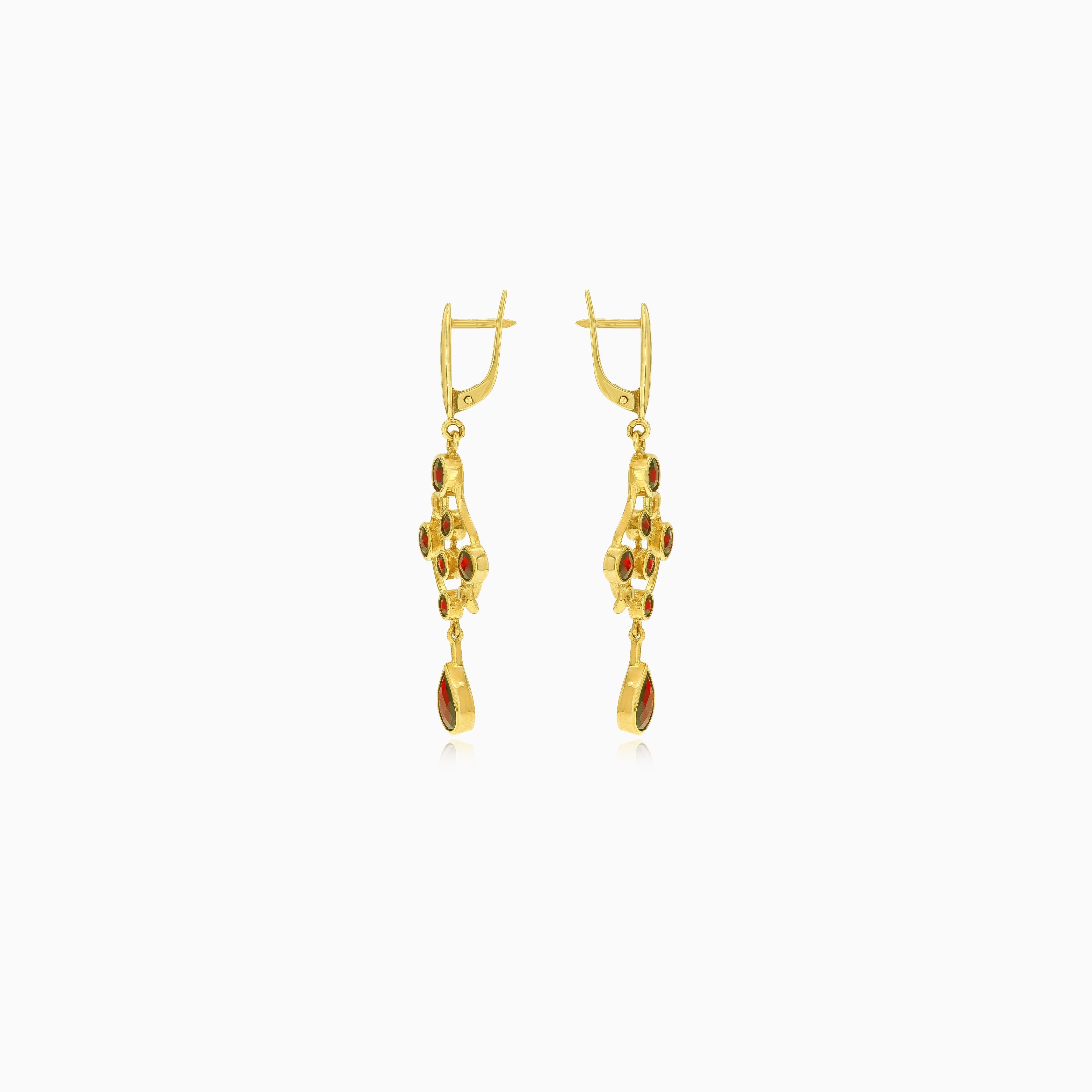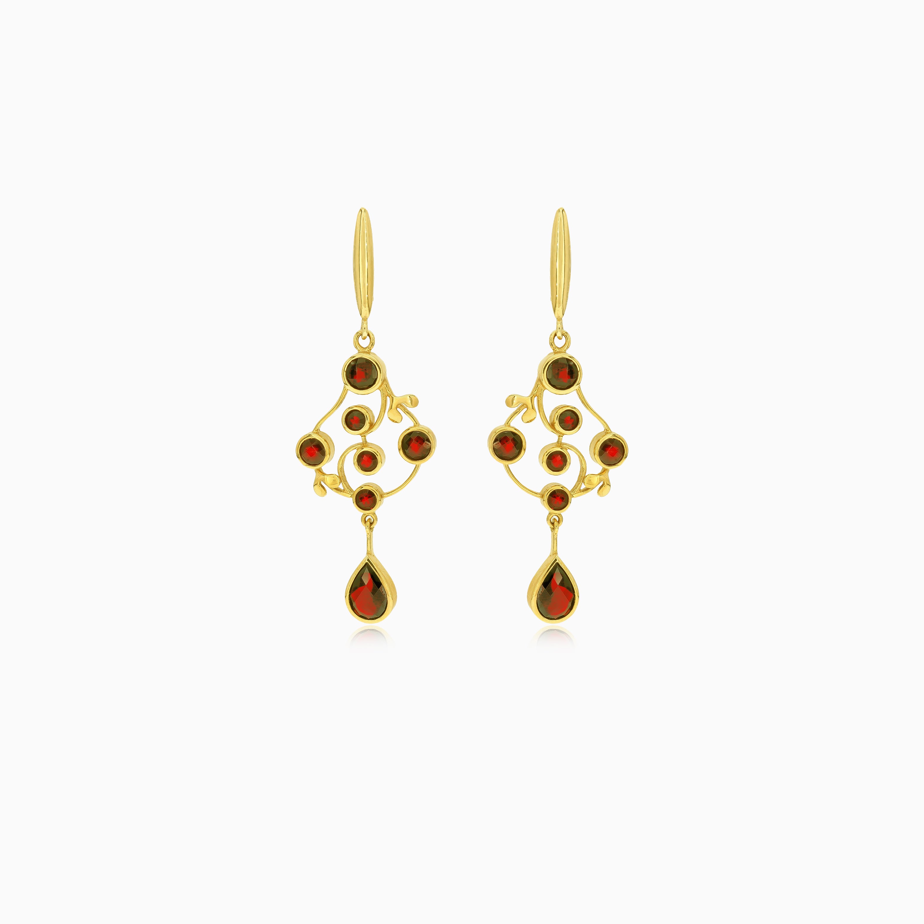Elevate your look with these elegant 14kt yellow gold dangling earrings featuring garnet stones in pear and round fine step-cut. The earrings are designed with a secure latch back closure and a bezel setting for added sophistication.