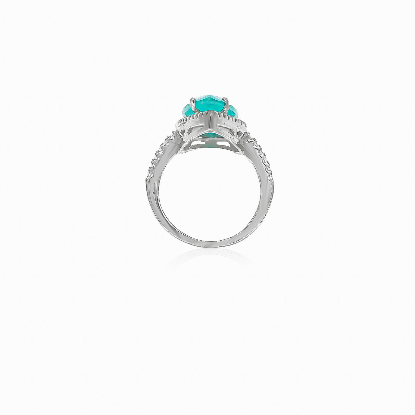 Elevate your style with our women's silver ring featuring synthetic tourmaline in pear fine step-cut and cubic zirconia in round fine step-cut, set in a prong setting.