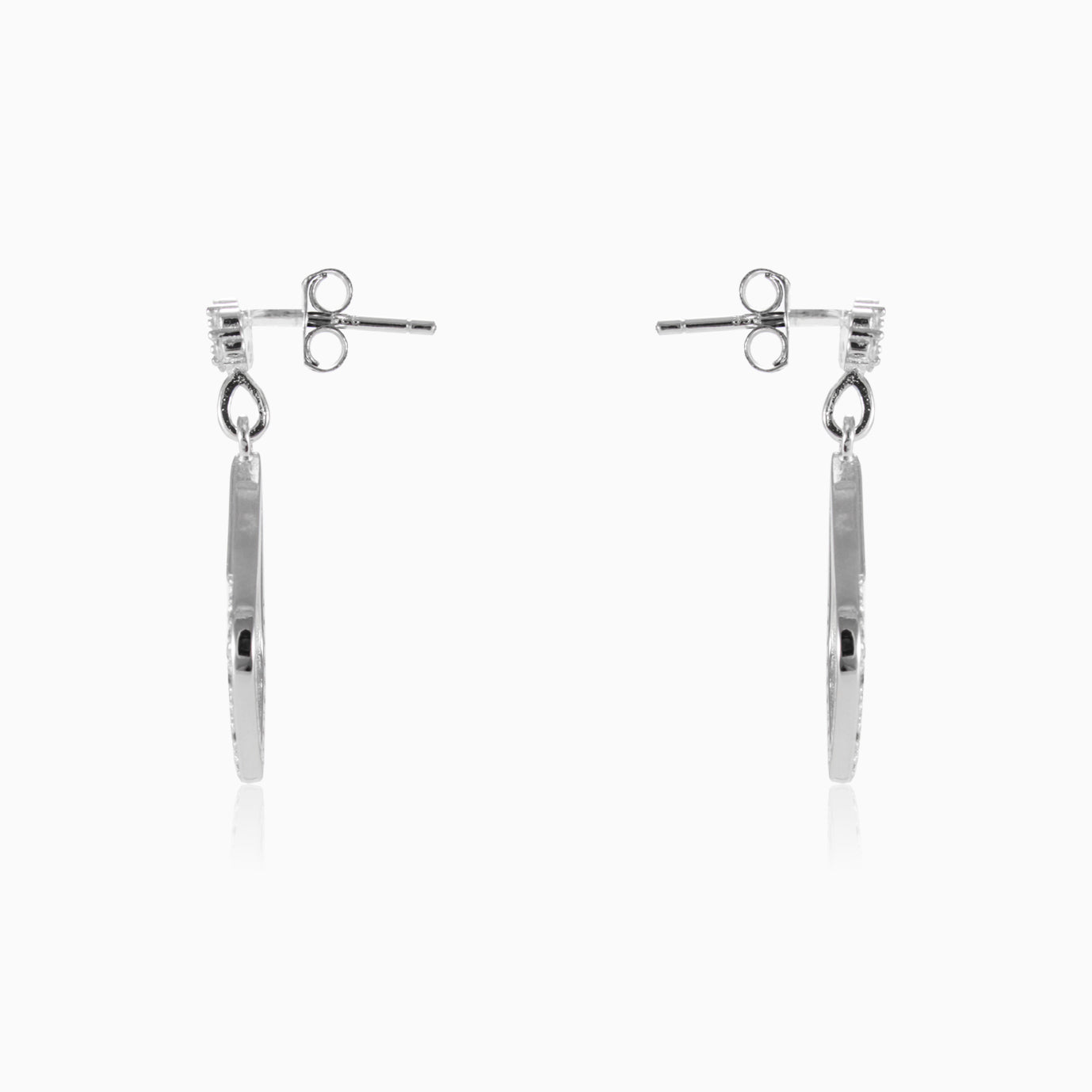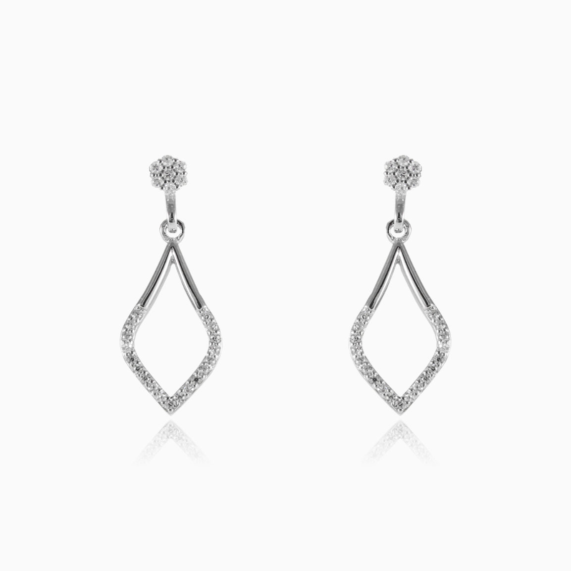 Soft geometric shaped earrings made of sterling silver and decorated with white around cut cubic zirconia.