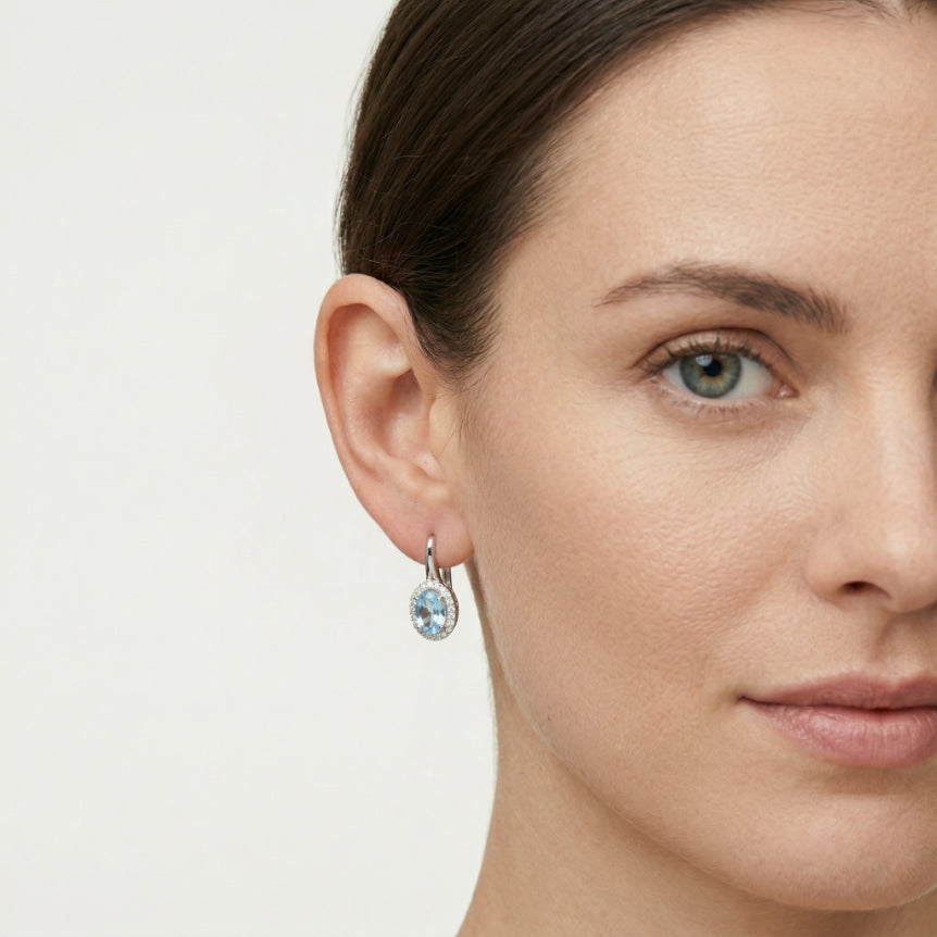 Classic 14K white gold earrings combined with oval aquamarine surrounded by a diamond halo.