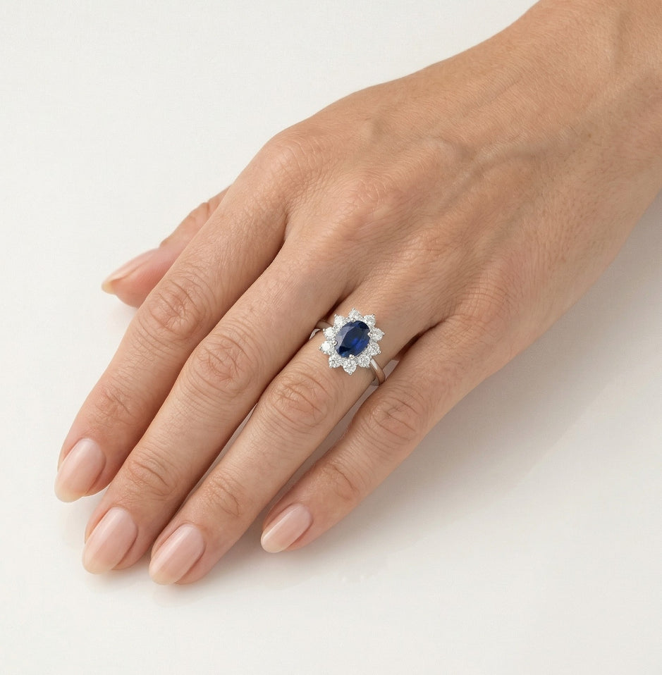 Elevate your style with this exquisite 18kt white gold ring adorned with a round fine step-cut diamond and an oval fine step-cut blue sapphire. Set in a classic 4 prong setting, it features a royal flower design for a touch of sophistication.