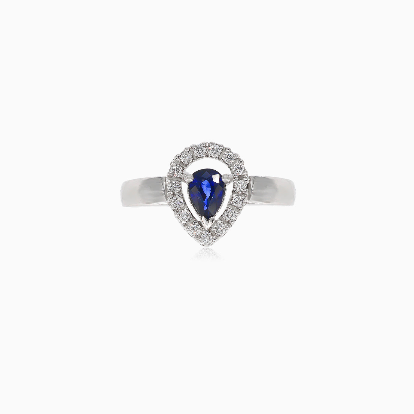 Adorn your finger with this exquisite 18kt white gold ring featuring diamonds in round fine step-cut and a captivating blue sapphire in pear fine step-cut. Set in a secure 4 prong setting, this ring combines timeless elegance with modern sophistication.