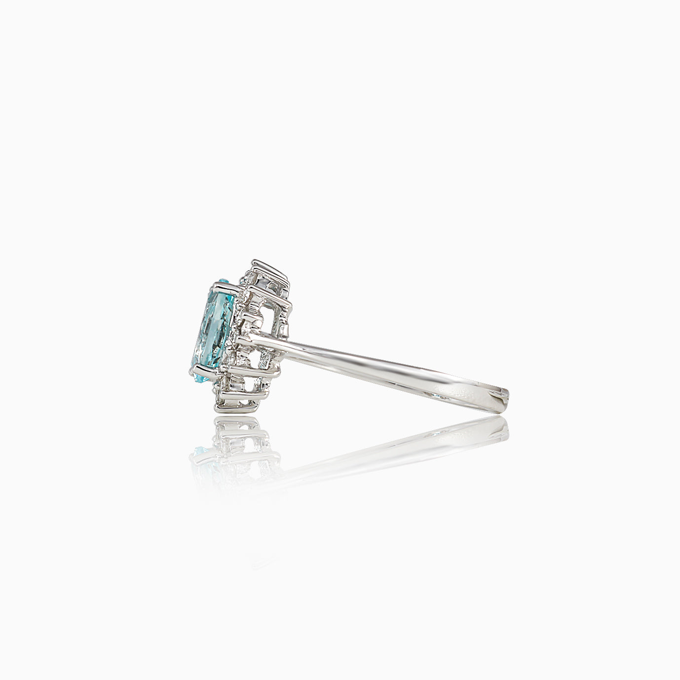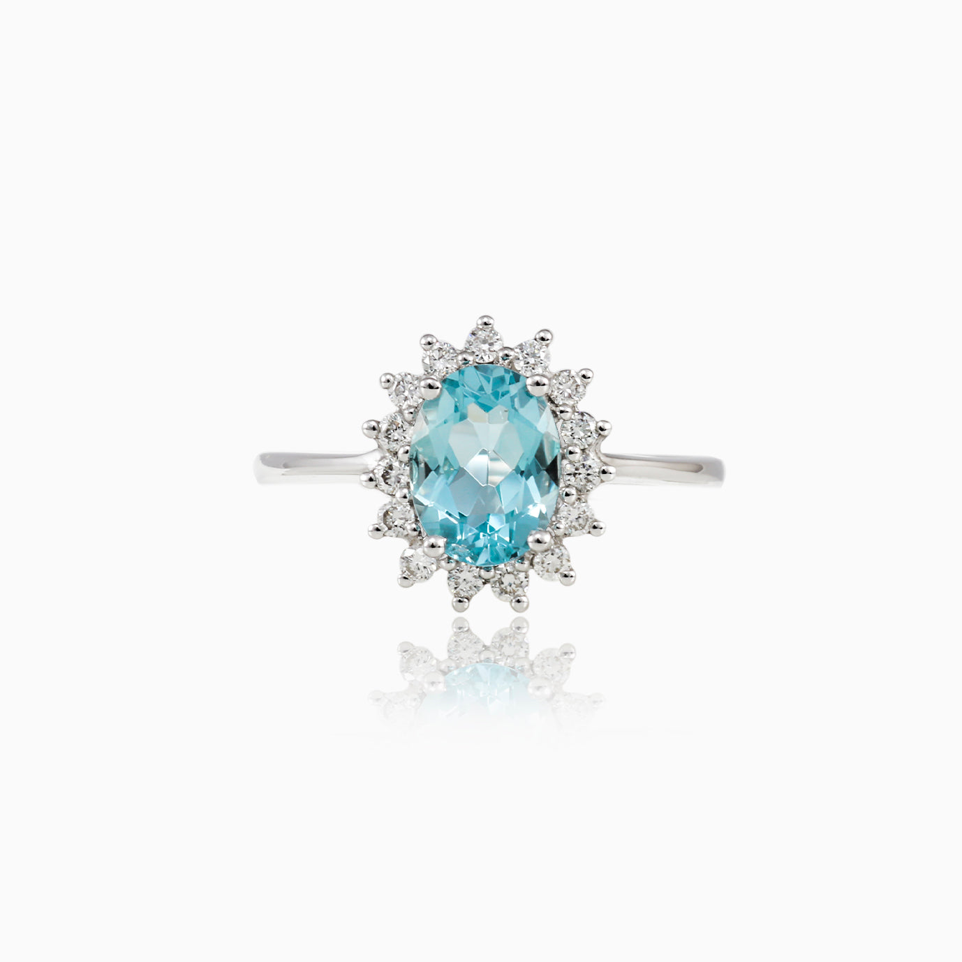 This 14ct white gold ring showcases an oval-cut aquamarine, surrounded by sparkling round-cut diamonds.
