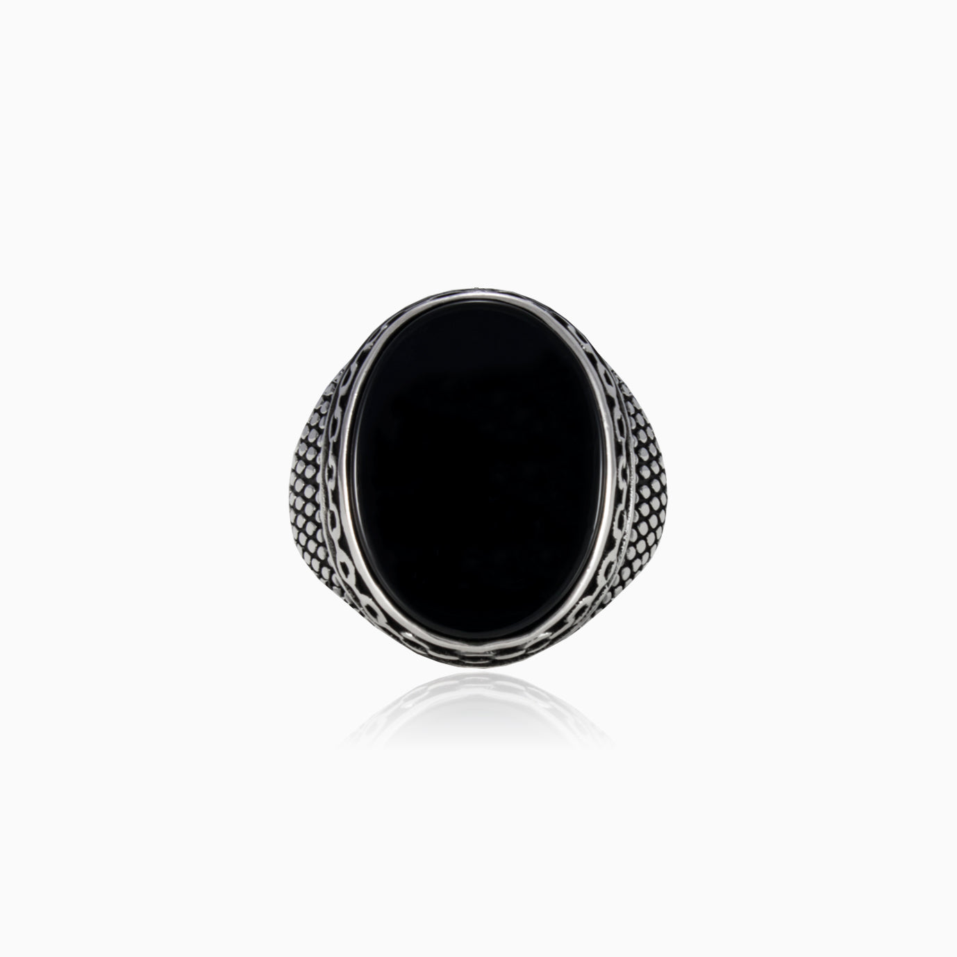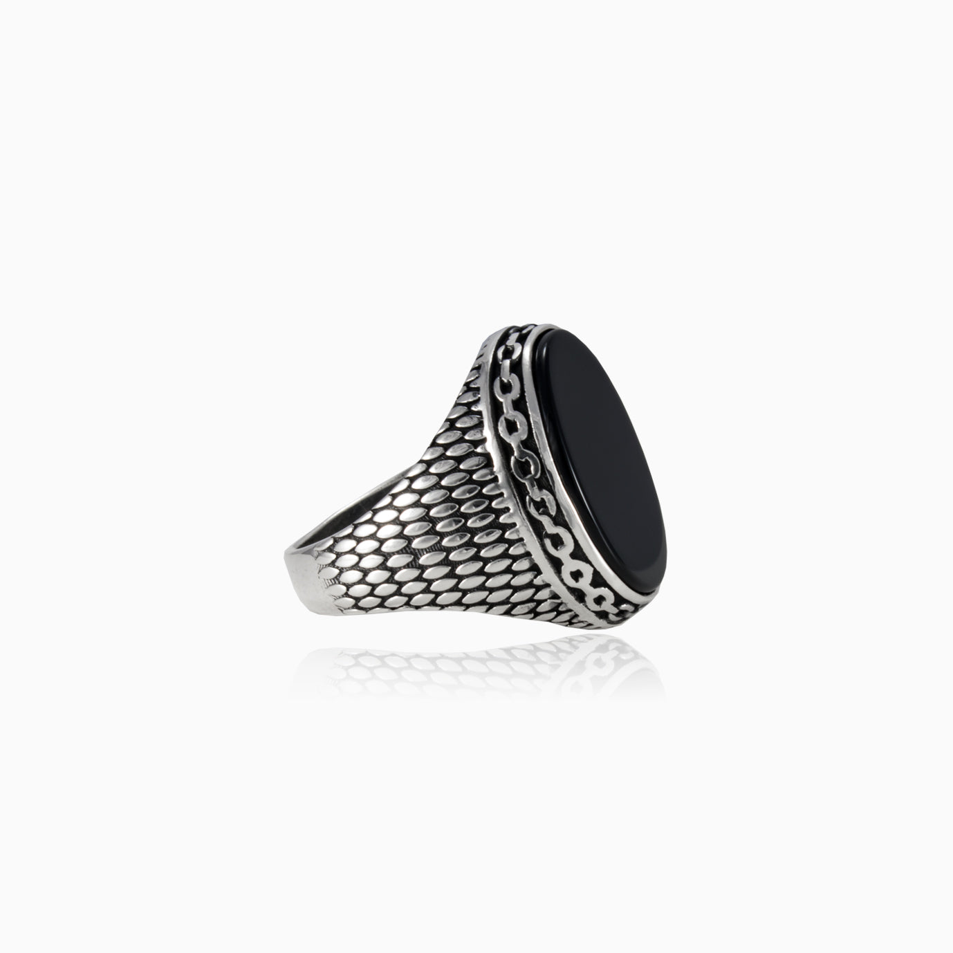 A sterling silver men ring featuring an oval cut onyx set in a refined bezel that highlights the stone’s deep tone and smooth shine. Detailed design elements along the band add character and craftsmanship while allowing the solitaire centerpiece to remain the focal point.