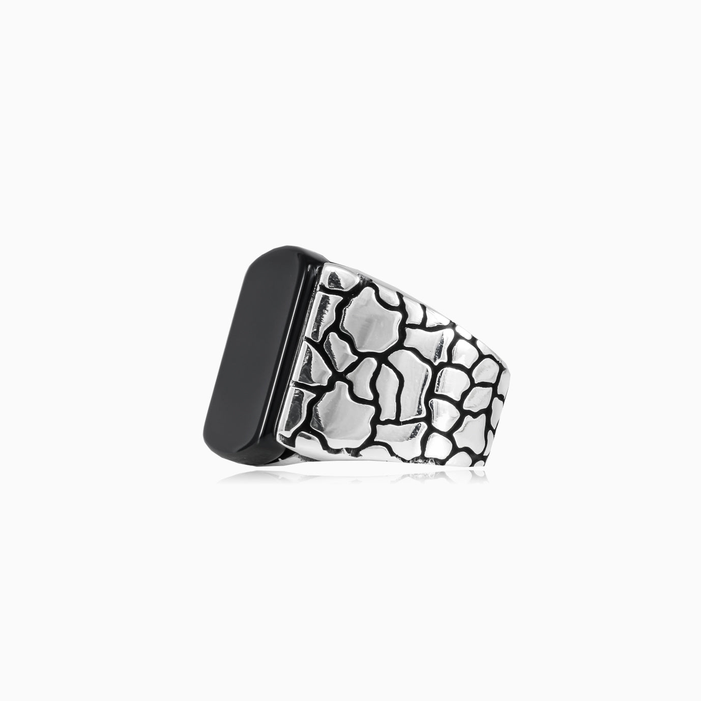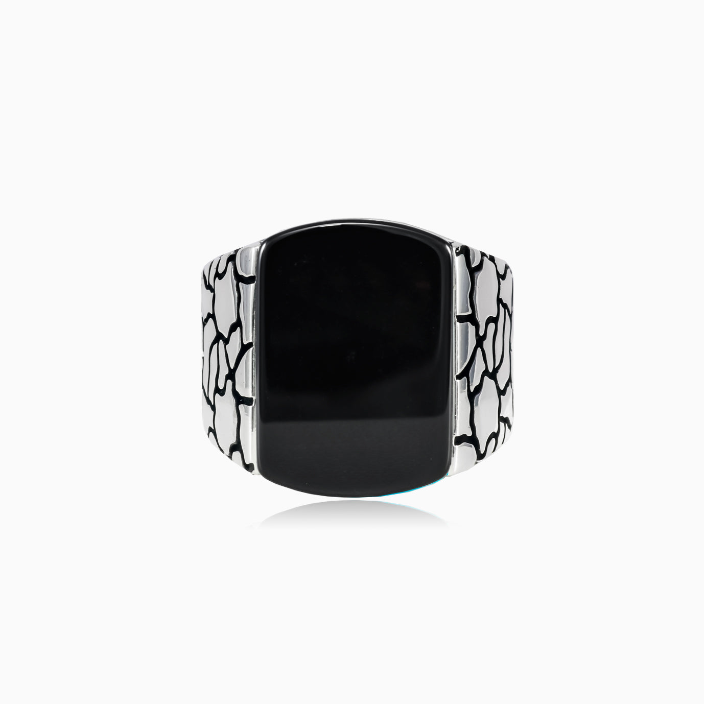 A sterling silver men ring crafted with a radiant cut onyx set securely in a smooth bezel that emphasizes its sharp facets and bold presence. The detailed design along the band enhances the ring’s character while keeping the solitaire stone as the striking centerpiece.