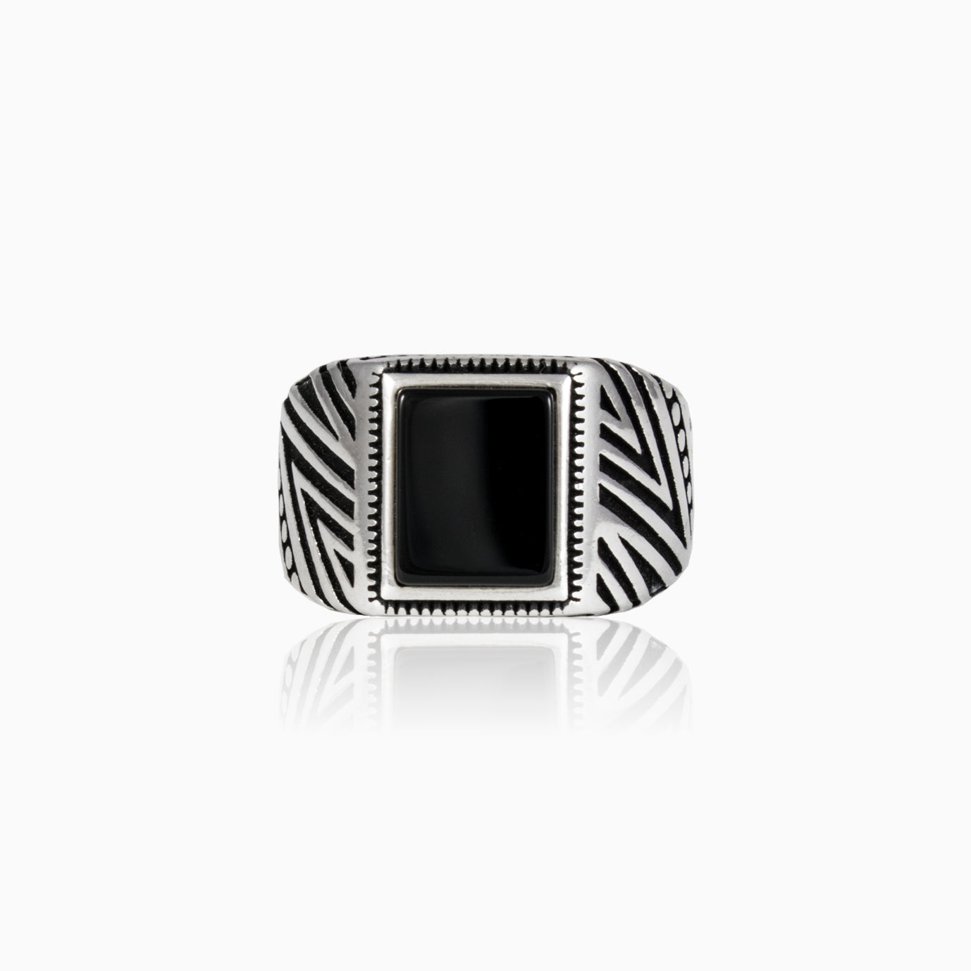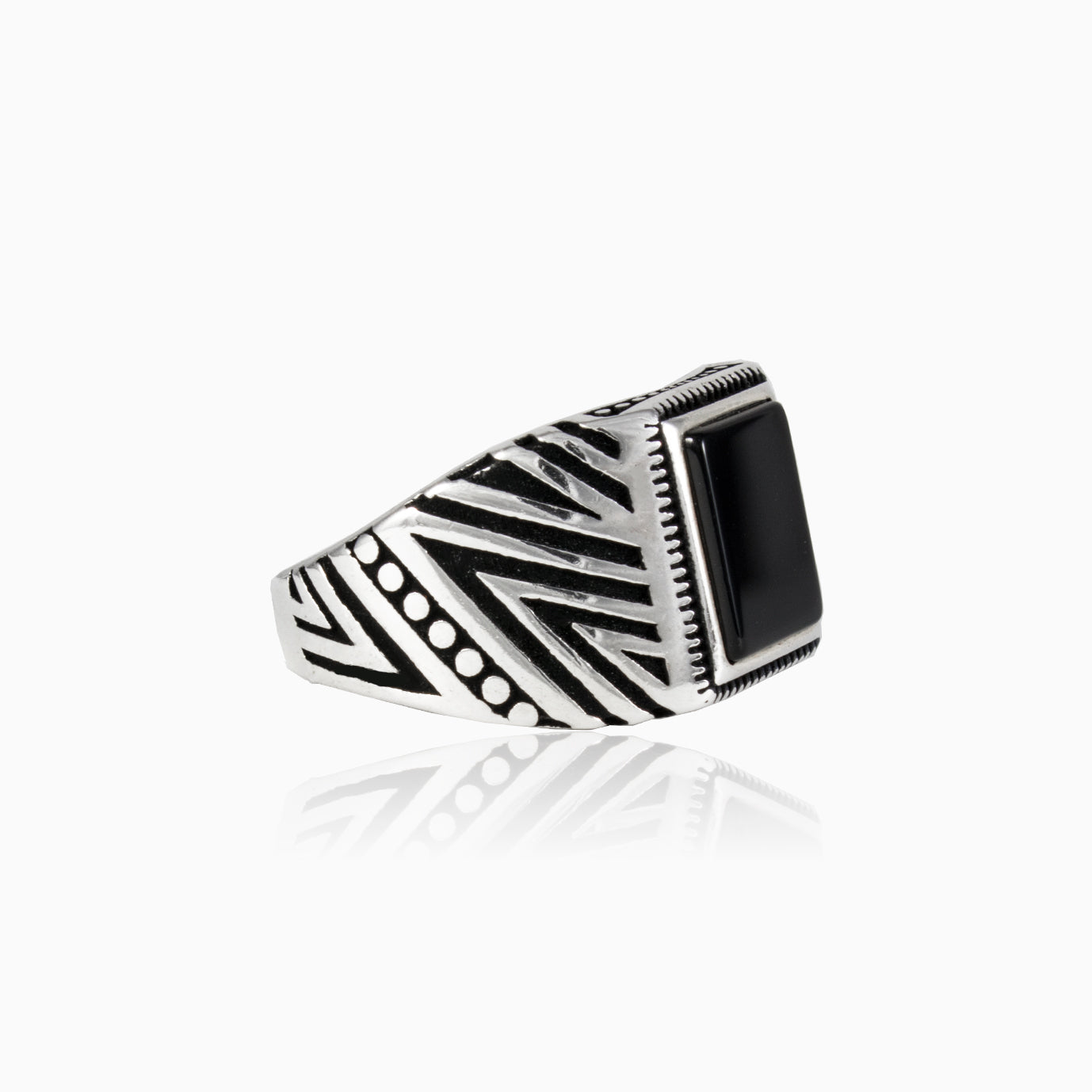 A sterling silver men ring featuring a square emerald cut onyx set boldly at the center. The bezel framed stone is complemented by refined line detailing along the sides of the band, adding depth and character to the design. Its clean geometry and structured accents create a confident look with a modern edge.