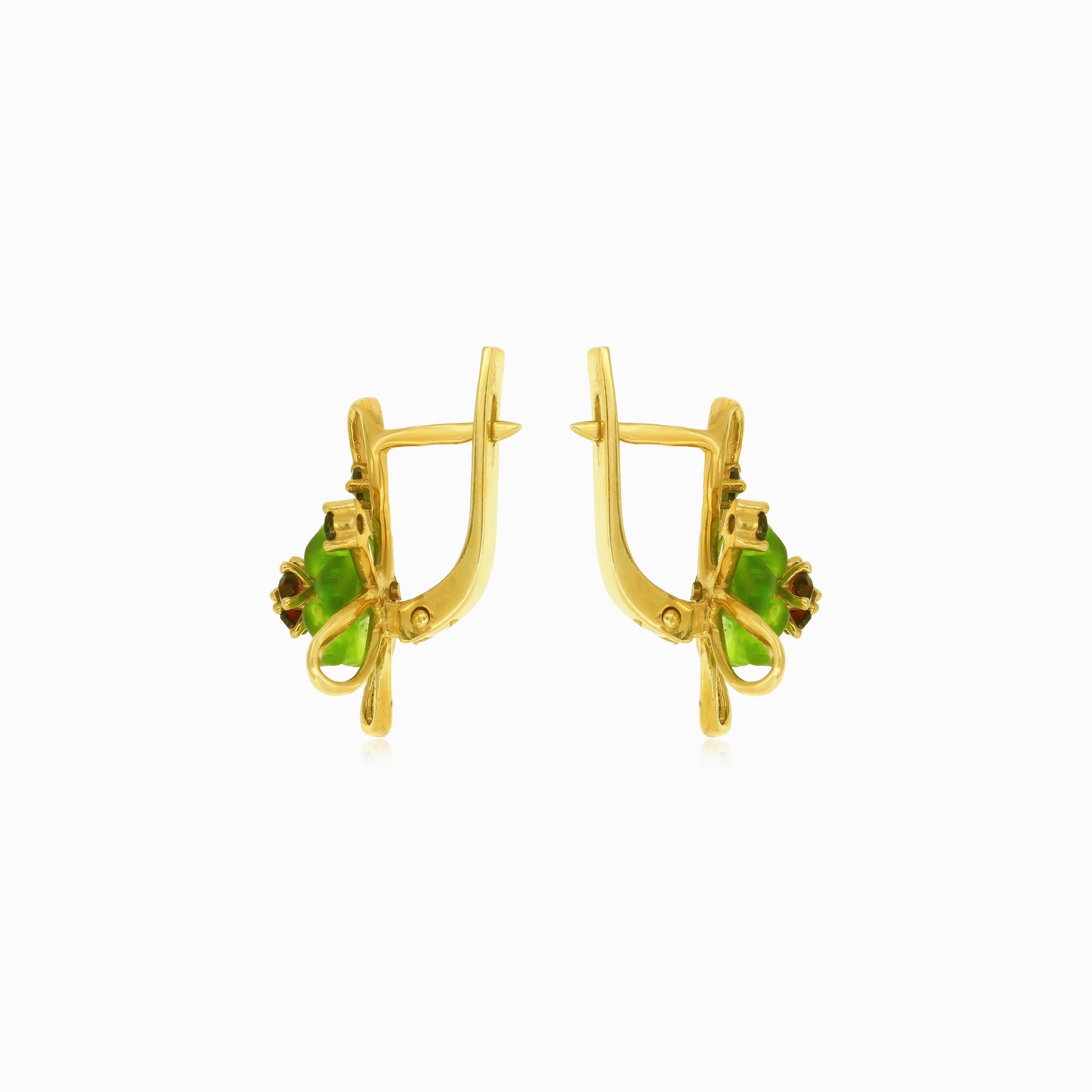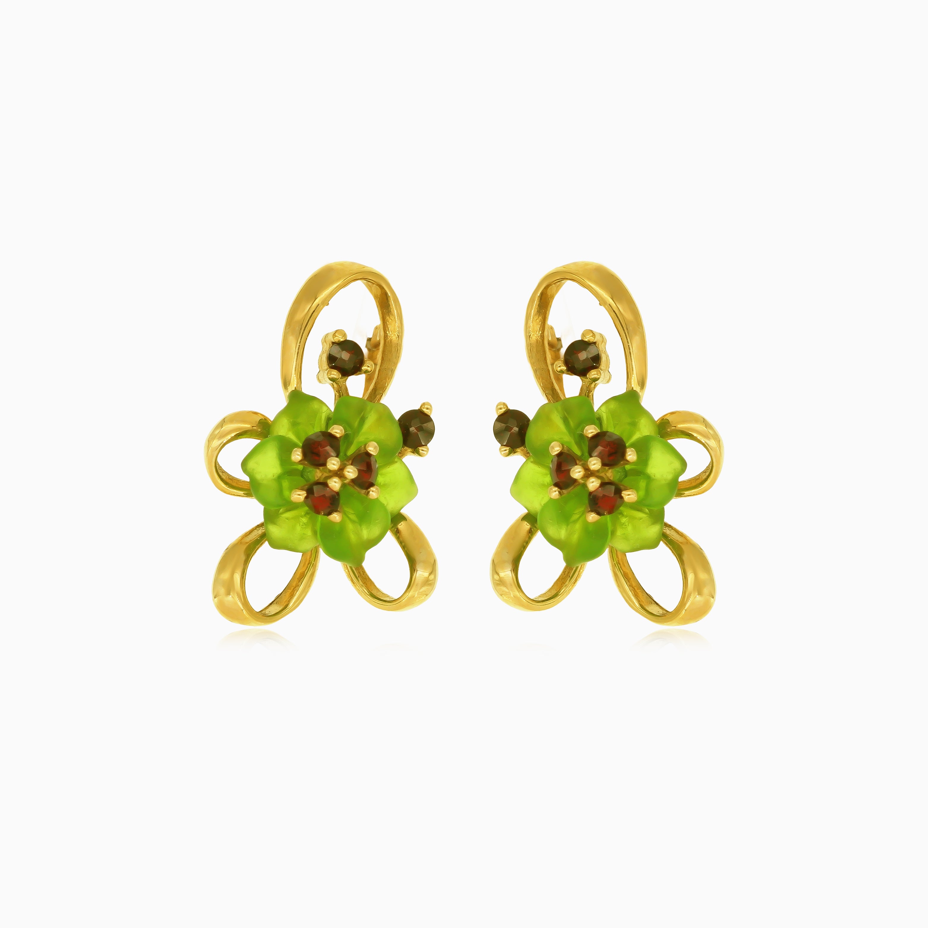 Elevate your style with these exquisite 14kt yellow gold flower drop earrings featuring fine step-cut quartz and garnet stones. The green and red gems are elegantly set in a 3 prong setting with latch back closure, creating a sophisticated and captivating accessory.