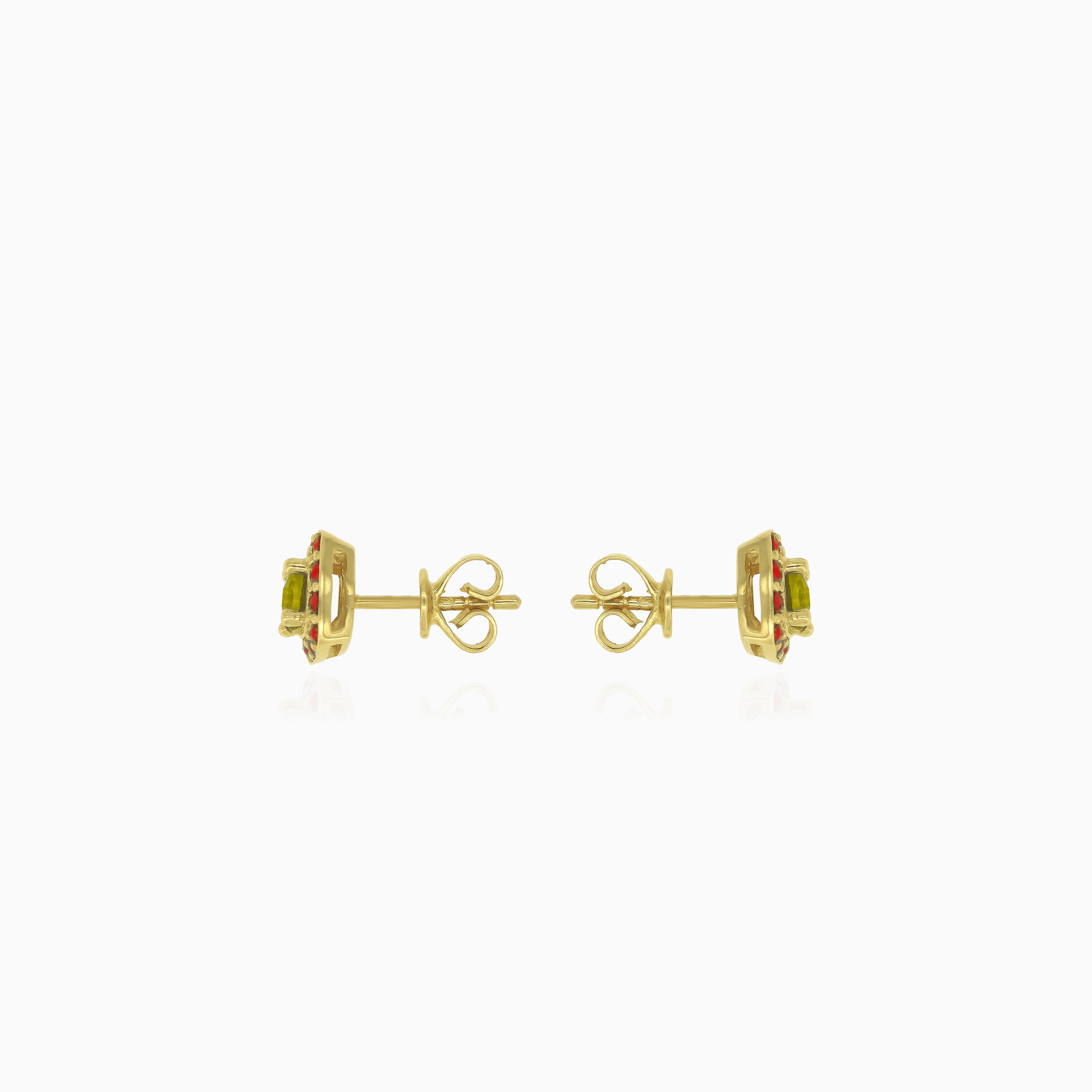 Eternal Radiance stud earrings in gold with moldavite and garnet
