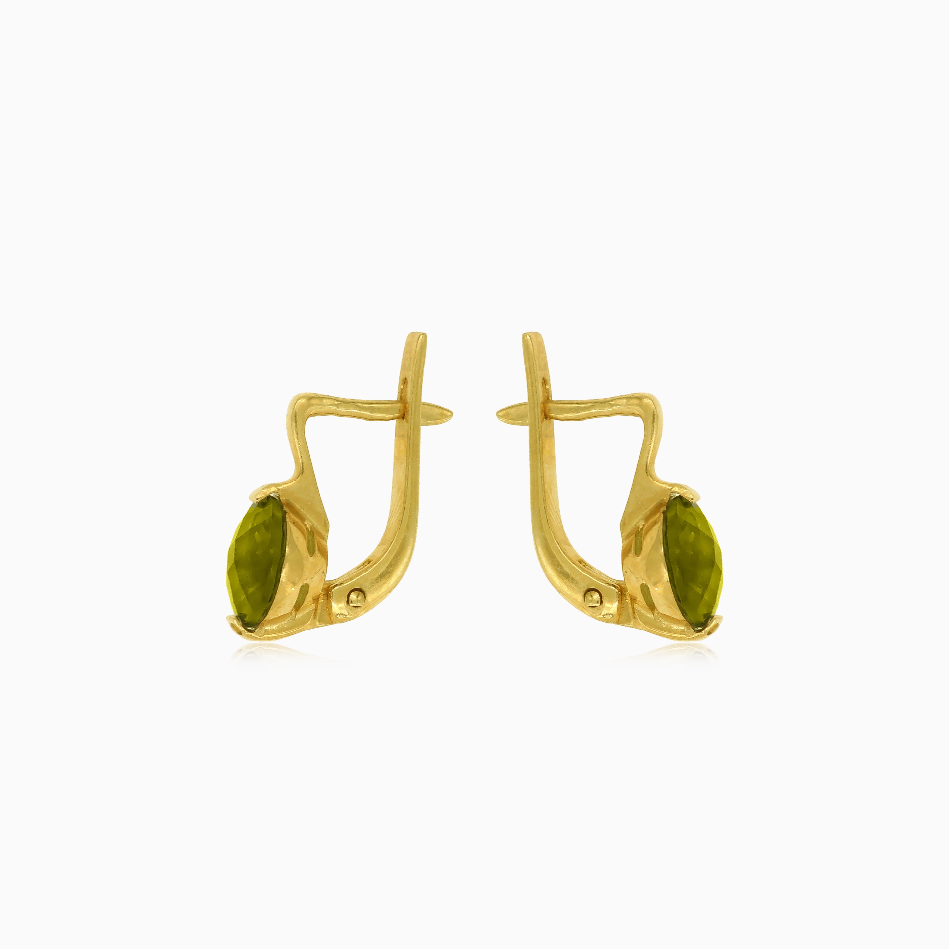 Immerse yourself in celestial charm with these drop earrings featuring moldavite in a round fine step-cut. The bar setting in 14kt yellow gold adds a touch of starlight elegance, and the secure latch-back closure ensures comfort and style. Elevate your look with this celestial-inspired jewelry.