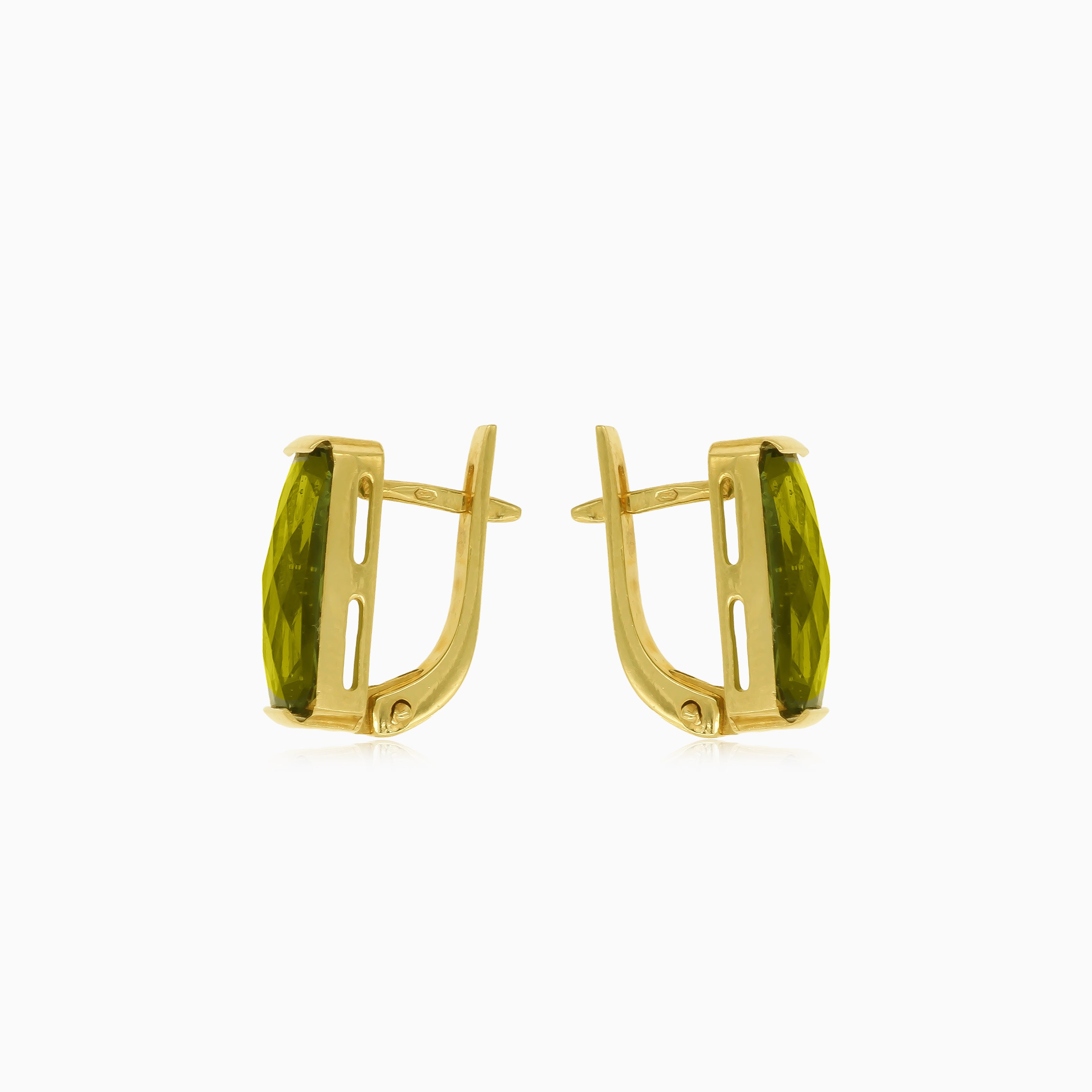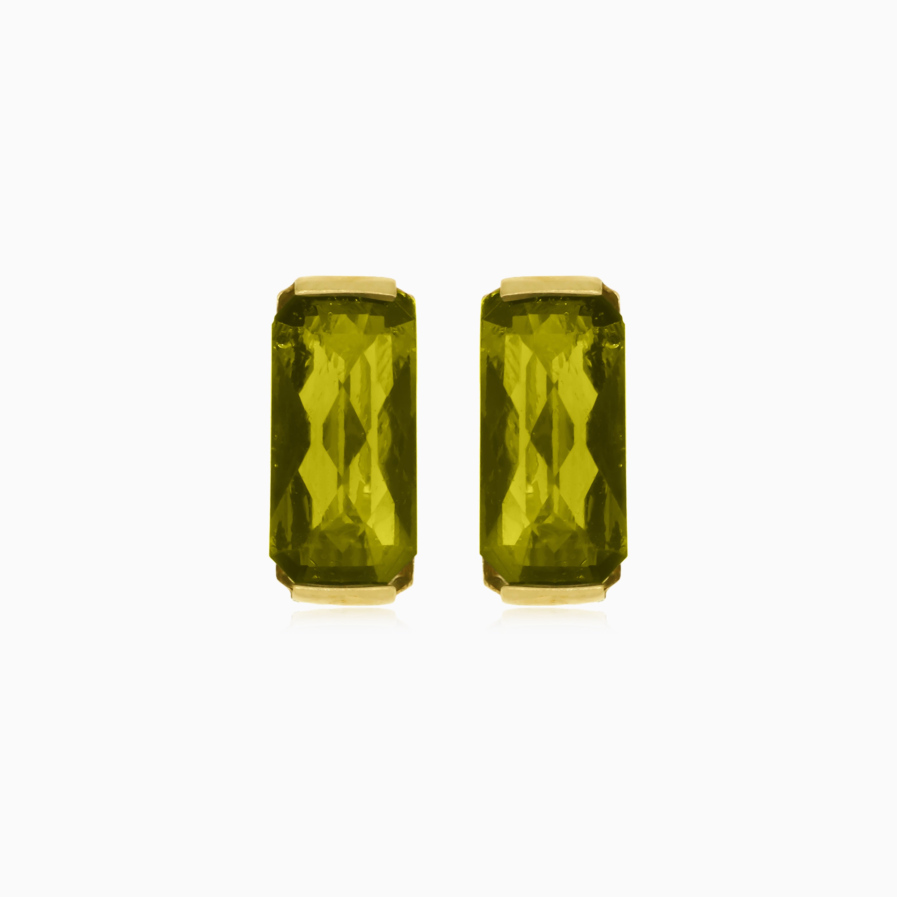 Adorn yourself with the radiant aura of these drop earrings featuring moldavite in a rectangular radiant-cut. The bar setting in 14kt yellow gold enhances the luminescent charm, and the secure latch-back closure ensures both style and comfort. Elevate your look with the celestial radiance of these exquisite earrings.