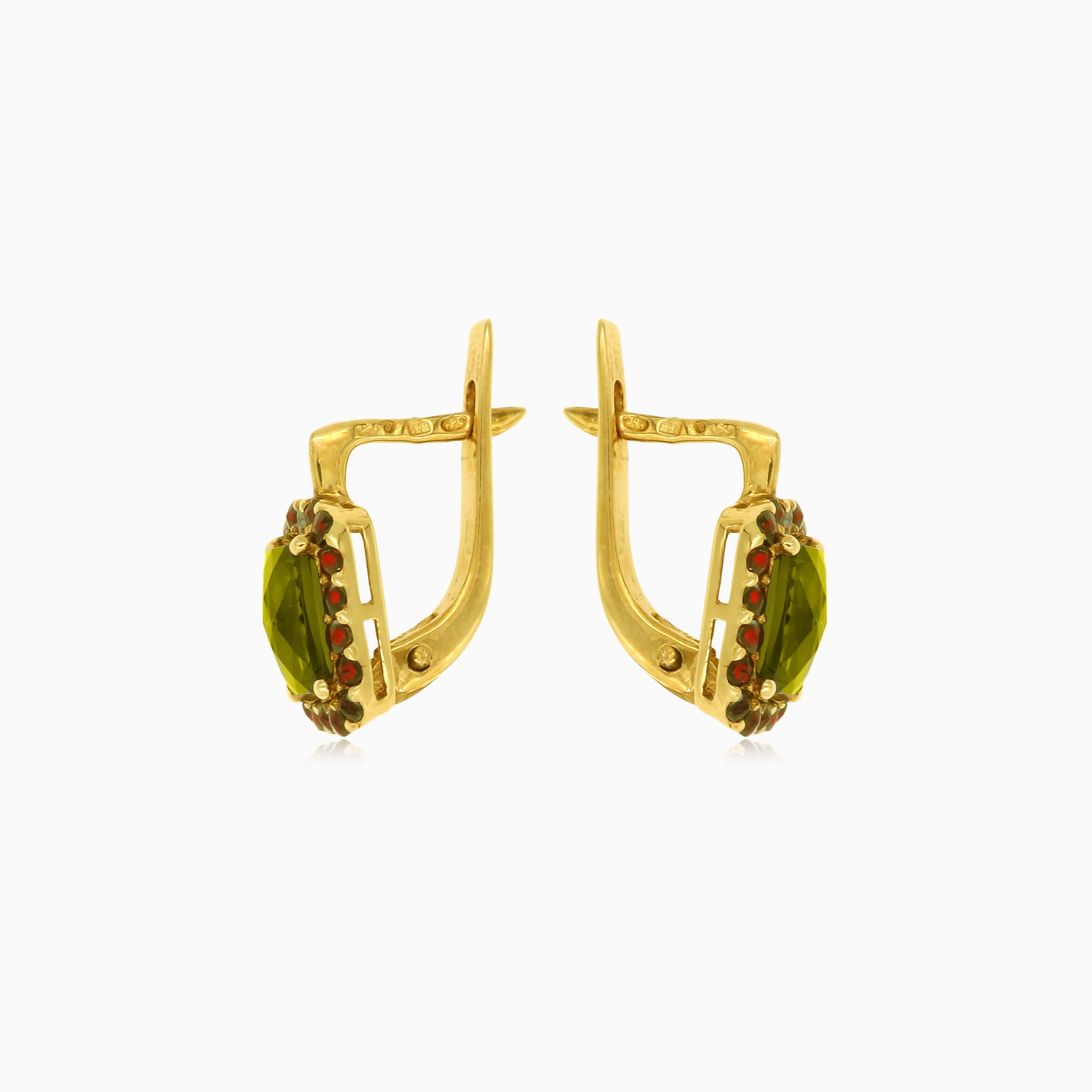 Elevate your style with these drop earrings featuring moldavite in a rectangular radiant-cut and garnet in a round fine step-cut. Set in a 4-prong arrangement of 14kt yellow gold, these earrings exude radiant elegance. The secure latch-back closure ensures comfort and style fit for royalty.