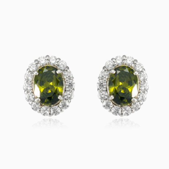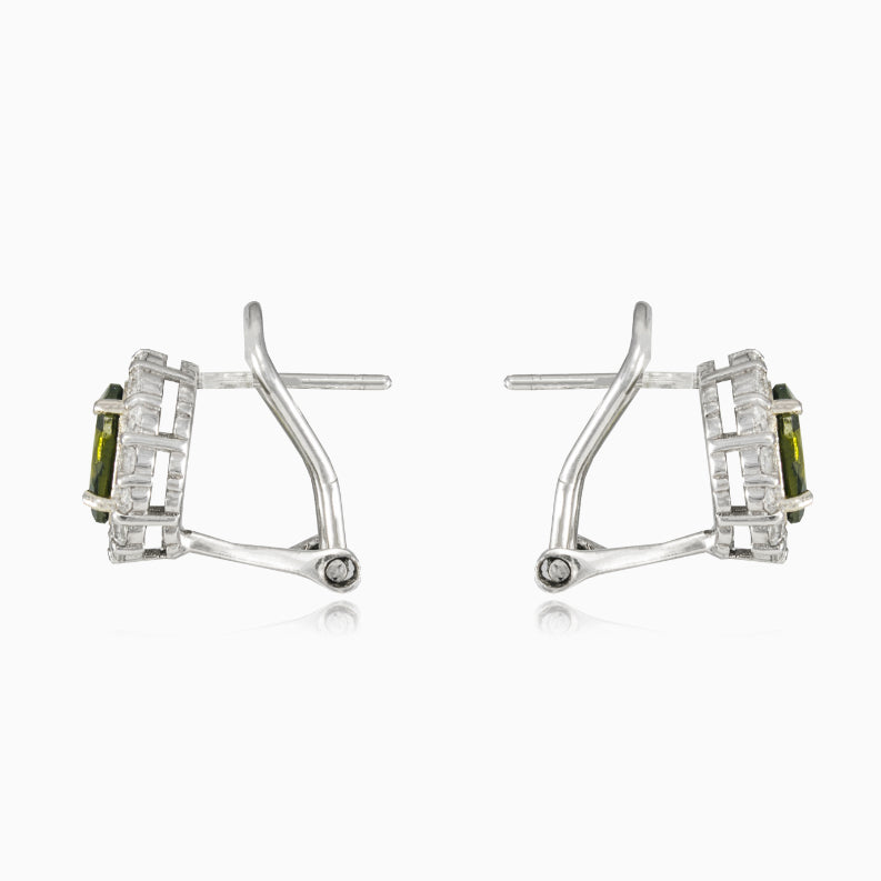 Sterling silver earrings for women in royal design combined with oval cut moldavite and decorated with halo of cubic zirconia.