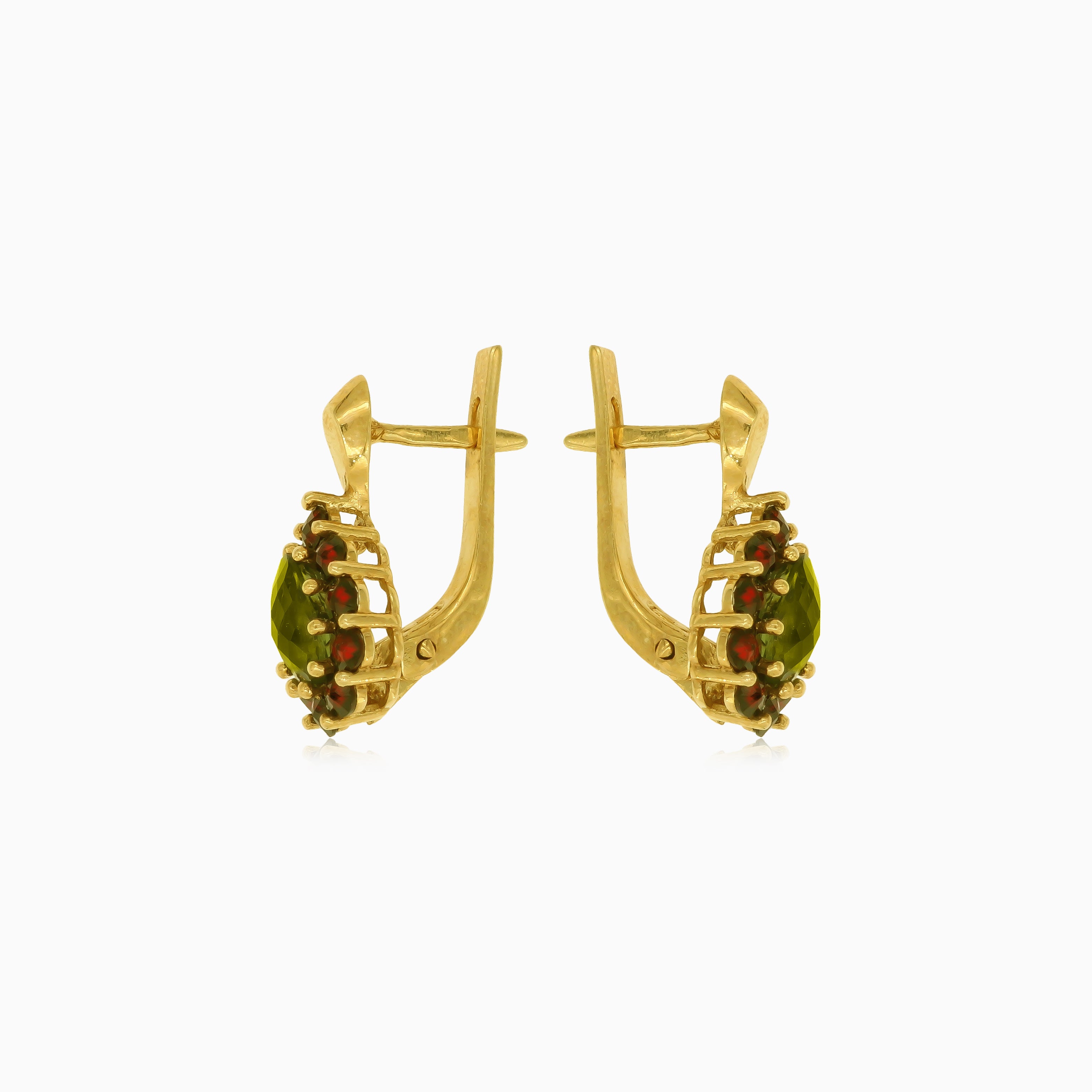 Experience the regal beauty of these drop earrings featuring a pear fine step-cut moldavite and a round fine step-cut garnet. Set in a shared prong arrangement in 14kt yellow gold, these earrings exude royal elegance. The secure latch-back closure ensures comfort and style fit for a princess.