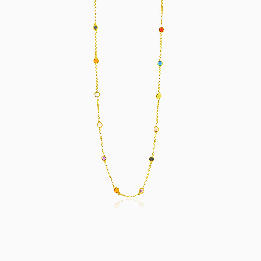 A vibrant multicolor necklace adorned with synthetic sapphire, topaz, cubic zirconia, rose quartz, amethyst, citrine, onyx, orange topaz, and synthetic ruby. The necklace fastens with a spring ring clasp connected to a golden heart.