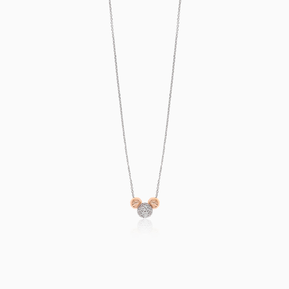 This delicate chain necklace is made of 14kt white and rose gold. The necklace is decorated with three fine beads, the centre bead is set with brilliant cut cubic zirconia and the side beads are made from rose gold and have a high shine.